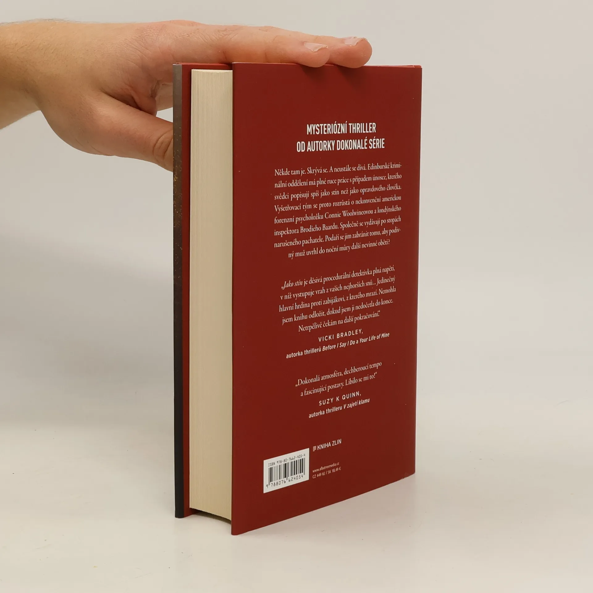 Mysteriózní thriller od autorky Dokonalé série Někde tam je. Skrývá se. A neustále se dívá. Edinburské kriminální oddělení má plné ruce práce s případem únosce, kterého svědci popisují spíš jako stín než jako opravdového člověka. Vyšetřovací tým se proto rozrůstá o nekonvenční americkou forenzní psycholožku Connie Woolwineovou a londýnského inspektora Brodieho Baardu. Společně se vydávají po stopách narušeného pachatele. Podaří se jim zabránit tomu, aby podivný muž uvrhl do noční můry další nevinné oběti?„Jako stín je děsivá procedurální detektivka plná napětí, v níž vystupuje vrah z vašich nejhorších snů… Jedinečný hlavní hrdina proti zabijákovi, z kterého mrazí. Nemohla jsem knihu odložit, dokud jsem ji nedočetla do konce. Netrpělivě čekám na další pokračování.“Vicki Bradley, autorka thrillerů Before I Say I Do a Your Life of Mine„Dokonalá atmosféra, dechberoucí tempo a fascinující postavy. Líbilo se mi to!“Suzy K Quinn, autorka thrilleru V zajetí klamu