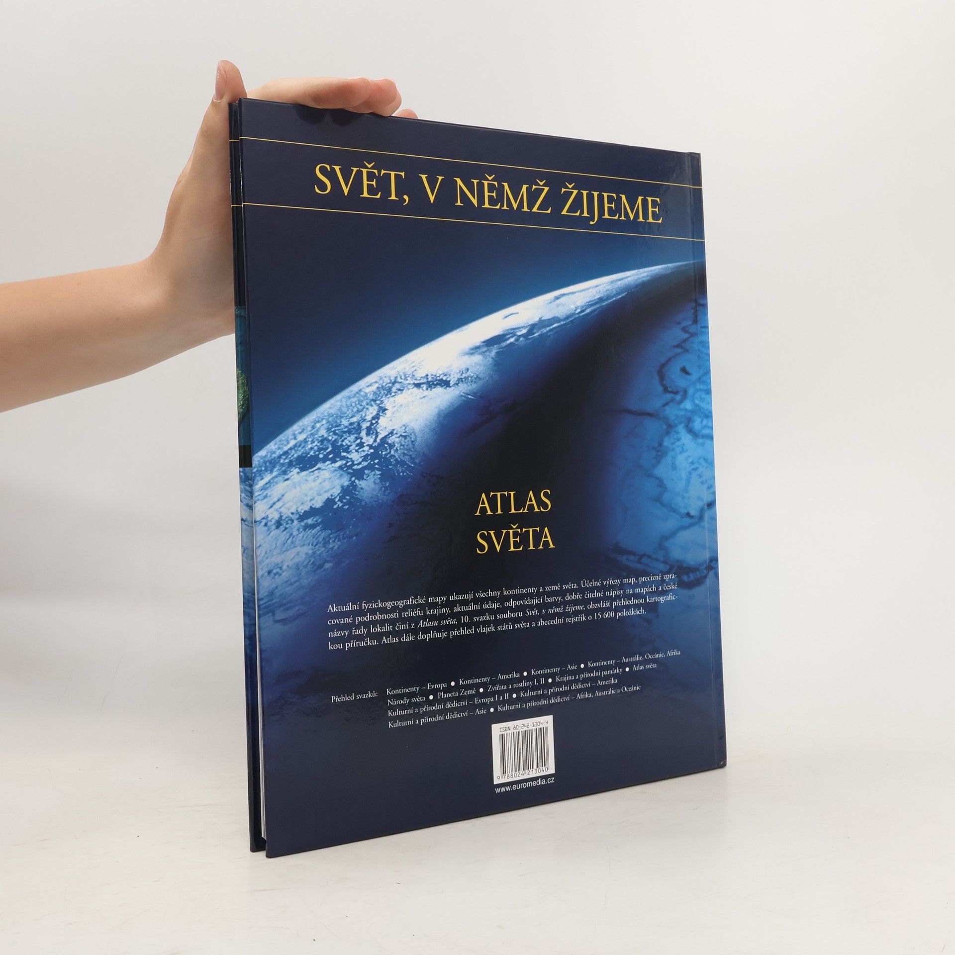 Aktuální fyzickogeografické mapy ukazují všechny kontinenty a země světa. Účelné výřezy map, precizně zpracované podrobnosti reliéfu krajiny, aktuální údaje, odpovídající barvy, dobře čitelné nápisy na mapách a české názvy řady lokalit činí z Atlasu světa, 10. svazku souboru Svět, v němž žijeme, obzvlášť přehlednou kartografickou příručku. Atlas dále doplňuje přehled vlajek států světa a abecední rejstřík o 15 600 položkách.