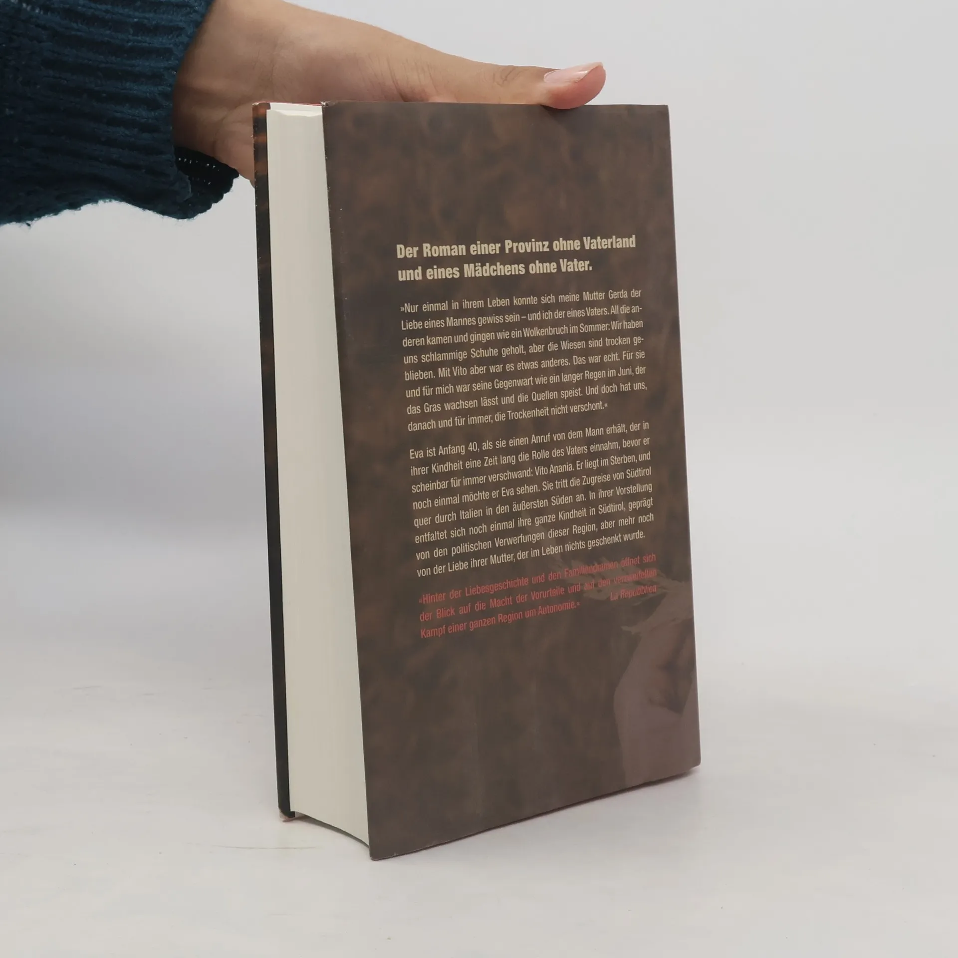 Der Roman einer Provinz ohne Vaterland und eines Mädchens ohne Vater „Nur einmal in ihrem Leben konnte sich meine Mutter Gerda der Liebe eines Mannes gewiss sein, und ich der eines Vaters. All die anderen kamen und gingen wie ein Wolkenbruch im Sommer: Wir haben uns schlammige Schuhe geholt, aber die Wiesen sind trocken geblieben. Mit Vito hingegen war es etwas anderes. Das war echt. Für sie und für mich war seine Gegenwart wie ein langer Regen im Juni, der das Gras wachsen lässt und die Quellen speist. Und doch hat uns, danach und für immer, die Trockenheit nicht verschont.” Eva ist Anfang vierzig, als sie einen Anruf von dem Mann erhält, der in ihrer Kindheit eine Zeit lang die Rolle des Vaters einnahm, bevor er scheinbar für immer verschwand: Vito Anania. Er liegt im Sterben, und noch einmal möchte er Eva sehen. Sie tritt die Zugreise von Südtirol quer durch Italien in den äußersten Süden an. In ihrer Vorstellung entfaltet sich noch einmal ihre ganze Kindheit in Südtirol: Sie wuchs im Schatten der politischen Verwerfungen einer Region auf, die drei Jahrzehnte lang der Spielball bedrohlicher Allianzen war, bevor sie endlich den Aufbruch in die Autonomie wagte. Doch noch stärker wurde Evas Kindheit geprägt von der Liebe ihrer Mutter, der im Leben nichts geschenkt wurde.