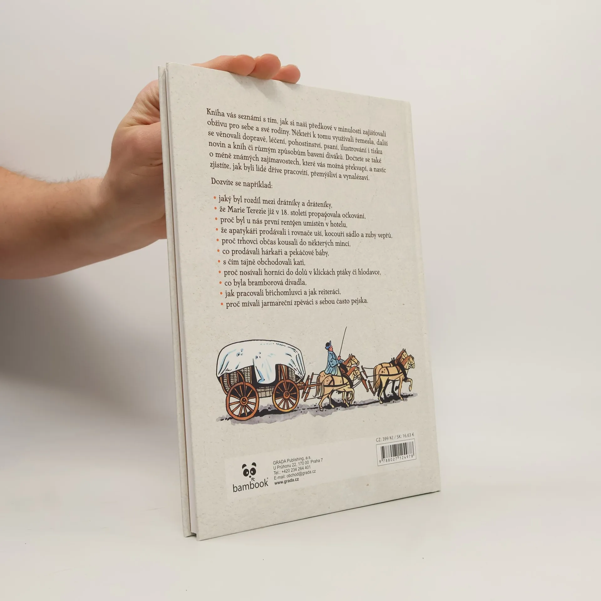 Kniha vás seznámí s tím, jak si naši předkové v minulosti zajišťovali obživu pro sebe a své rodiny. Někteří k tomu využívali řemesla, další se věnovali dopravě, léčení, pohostinství, psaní, ilustrování i tisku novin a knih či různým způsobům bavení diváků. Dočtete se také o méně známých zajímavostech, které vás možná překvapí, a navíc zjistíte, jak byli lidé dříve pracovití, přemýšliví a vynalézaví. Dozvíte se například: jaký byl rozdíl mezi drátníky a dráteníky, že Marie Terezie již v 18. století propagovala očkování, proč byl u nás první rentgen umístěn v hotelu, že apatykáři prodávali i rovnače uší, kocouří sádlo a zuby vepřů, proč trhovci občas kousali do některých mincí, co prodávali hárkaři a pekáčové báby, s čím tajně obchodovali kati, proč nosívali horníci do dolů v klíckách ptáky či hlodavce, co byla bramborová divadla, jak pracovali břichomluvci a jak reiteráci, proč mívali jarmareční zpěváci s sebou často pejska.