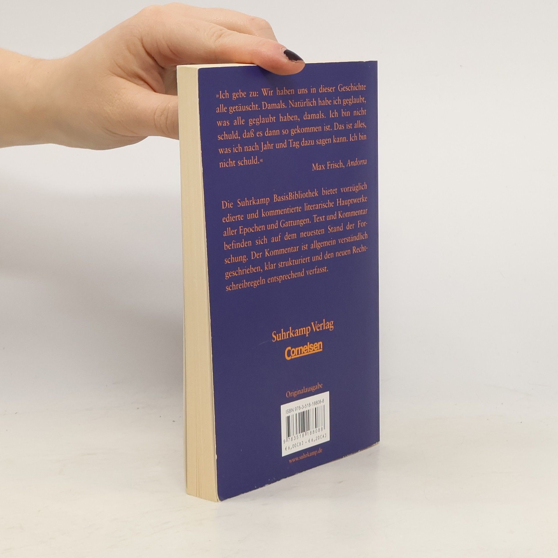 Die Kernzelle von Andorra findet sich in Max Frischs Tagebuch als Eintragung des Jahres 1946. Andorra ist der Name für ein Modell: Es zeigt den Prozess einer Bewusstseinsveränderung, abgehandelt an der Figur des jungen Andri, den die Umwelt so lange zum Anderssein zwingt, bis er es als sein Schicksal annimmt. Dieses Schicksal heißt in Max Frischs Stück »Judsein«. Das Schauspiel erschien als Buchausgabe zuerst 1961. Diese Ausgabe der »Suhrkamp BasisBibliothek – Arbeitstexte für Schule und Studium« bietet nicht nur Max Frischs Stück Andorra, seine »Anmerkungen zu Andorra«, die »Notizen von den Proben« sowie seine Prosaskizze »Der andorranische Jude«, sondern auch einen Kommentar, der alle für das Verständnis des Werks erforderlichen Informationen enthält: eine Zeittafel, die Entstehungs- und Textgeschichte, einen Überblick über die Aufführungs- und Rezeptionsgeschichte, eine Analyse der unterschiedlichen Deutungsansätze, Literaturhinweise sowie Wort- und Sacherläuterungen. Die Schreibweise des Kommentars entspricht den neuen Rechtschreibregeln.