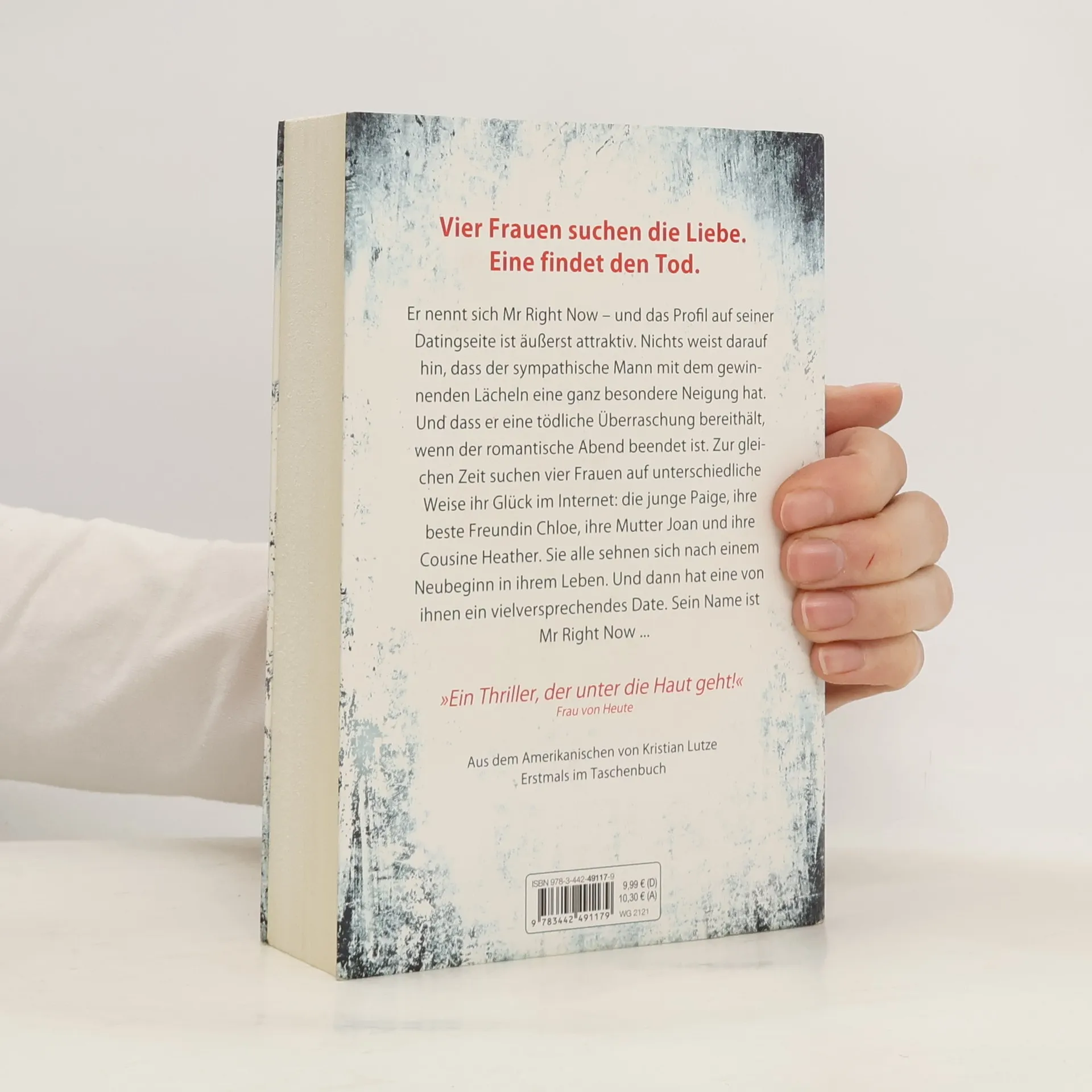 Vier Frauen suchen die Liebe. Eine findet den Tod. Er nennt sich Mr Right Now – und das Profil auf seiner Datingseite ist äußerst attraktiv. Nichts weist darauf hin, dass der sympathische Mann mit dem gewinnenden Lächeln eine ganz besondere Neigung hat. Und dass er eine tödliche Überraschung bereithält, wenn der romantische Abend beendet ist. Zur gleichen Zeit suchen vier Frauen auf unterschiedliche Weise ihr Glück im Internet: die junge Paige, ihre beste Freundin Chloe, ihre Mutter Joan und ihre Cousine Heather. Sie alle sehnen sich nach einem Neubeginn in ihrem Leben. Und dann hat eine von ihnen ein vielversprechendes Date. Sein Name ist Mr Right Now …
