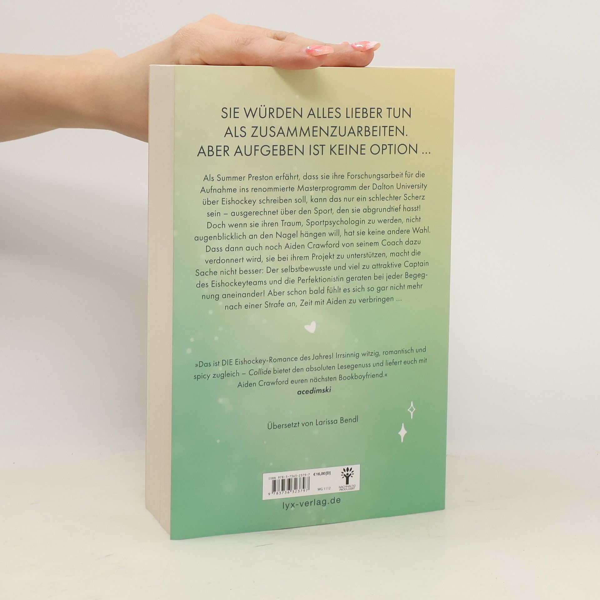 In "COLLIDE" muss Summer Preston eine Abschlussarbeit über Eishockey schreiben, obwohl sie den Sport hasst. Gemeinsam mit dem attraktiven Captain Aiden Crawford gerät sie in Konflikte. Beide sind ehrgeizig und geben nicht auf, was zu einer spannenden und leidenschaftlichen Geschichte führt. Band 1 der OFF-THE-ICE-Reihe.