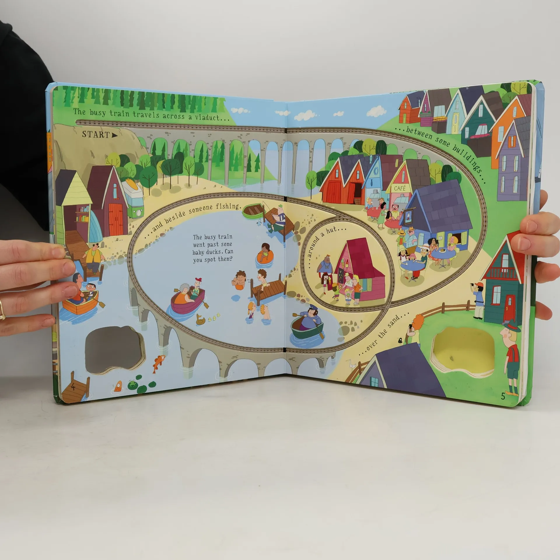 Pull-back the train to start its 'engine' then place it on the tracks and watch it zoom away from the city station, across bridges and fields, over a long viaduct until it reaches its destination at the zoo.