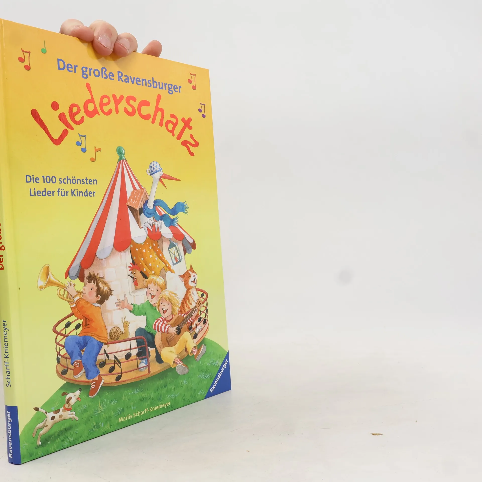 Der große Ravensburger Liederschatz bietet über 100 beliebte deutsche Kinderlieder mit Noten und Gitarrenakkorden. Fantasievoll illustriert von Marlies Scharff-Kniemeyer, lädt das Buch zum Singen und Musizieren ein, ideal für Kindergarten, Schule und Zuhause. Enthalten sind Lieder zu Märchen, Geschichten, Gute-Nacht und Weihnachten.