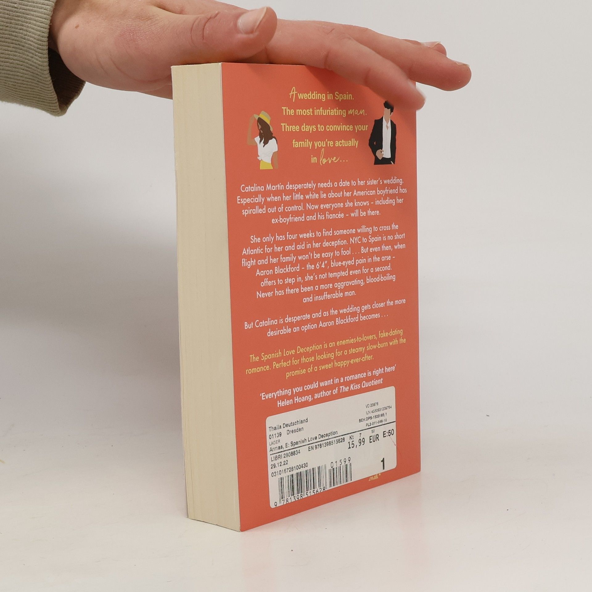A wedding in Spain. The most infuriating man. Three days to convince your family you're actually in love. . . Catalina Martín desperately needs a date to her sister's wedding. Especially when her little white lie about her American boyfriend has spiralled out of control. Now everyone she knows – including her ex-boyfriend and his fiancée – will be there. She only has four weeks to find someone willing to cross the Atlantic for her and aid in her deception. NYC to Spain is no short flight and her family won't be easy to fool. . . But even then, when Aaron Blackford – the 6'4", blue-eyed pain in the arse – offers to step in, she's not tempted even for a second. Never has there been a more aggravating, blood-boiling and insufferable man. But Catalina is desperate and as the wedding gets closer the more desirable an option Aaron Blackford becomes. . . The Spanish Love Deception is an enemies-to-lovers, fake-dating romance. Perfect for those looking for a steamy slow-burn with the promise of a sweet happy-ever-after.