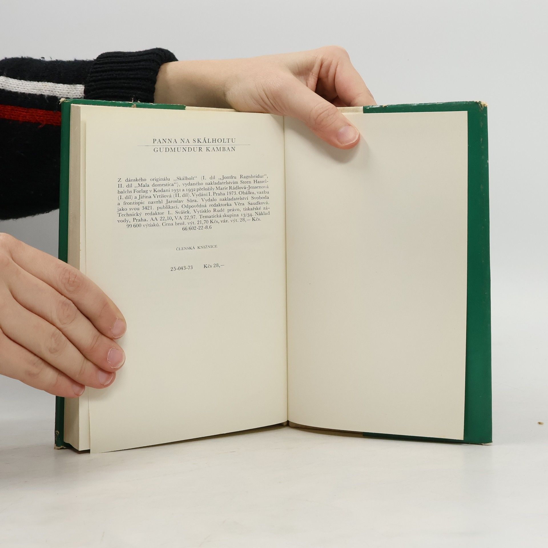 První dva díly (Panna Ragnheidur, Mala domestica) čtyřdílného románového cyklu Skálholt významného představitele zakladatelské generace moderní islandské literatury (1888-1945). Široce koncipovaná sága o tragické lásce dcery islandského biskupa je vyprávěna podle skutečného příběhu z druhé poloviny 17. století. Hrdinka se odmítá provdat za muže ze vznešeného a bohatého rodu, kterého jí zvolil otec, a podléhá svodu mladého kněze a má s ním dítě.Nepochopení a nepřátelství otce pro tento domněle hříšný čin přerušuje jen její nemoc a nakonec smrt. 25-043-73