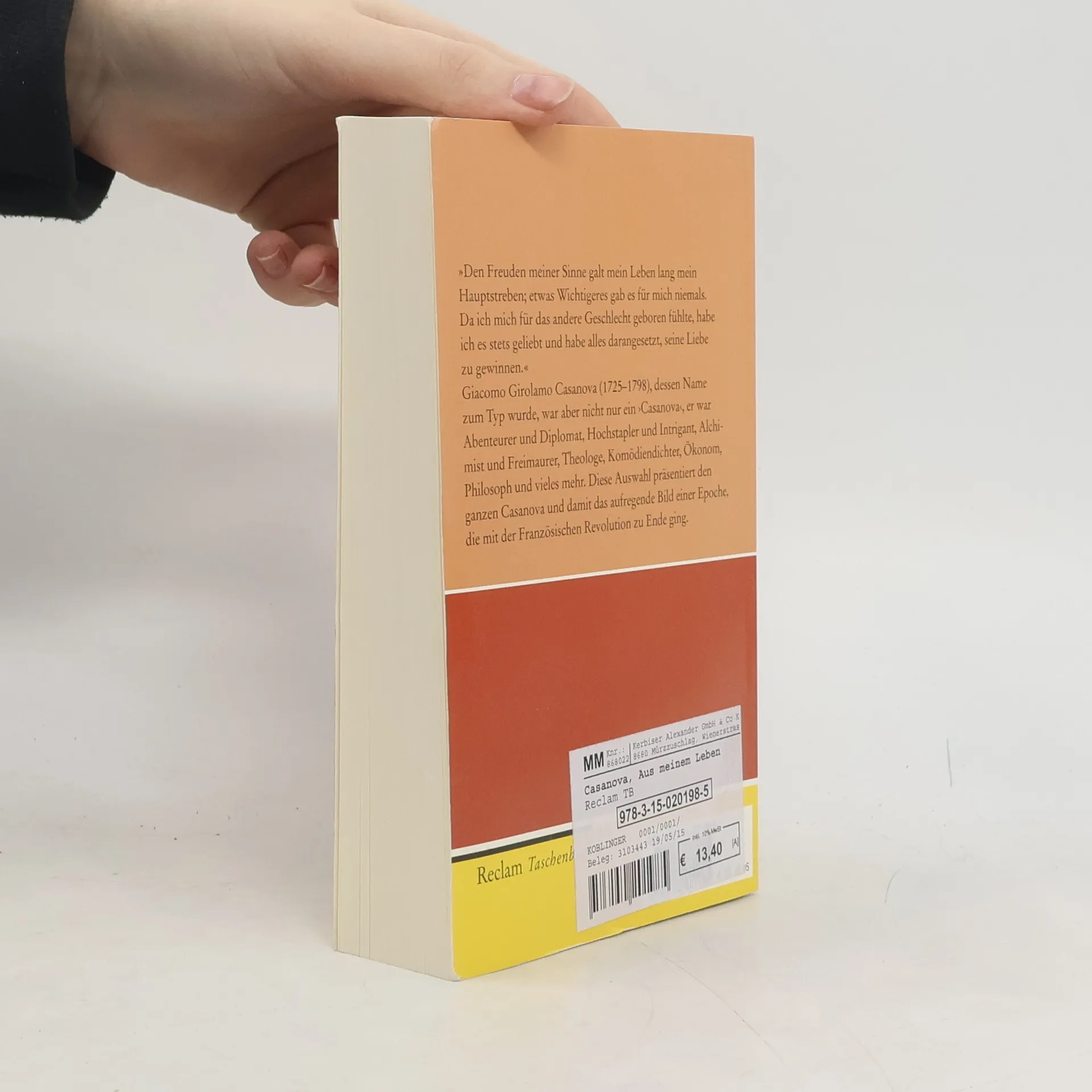 »Den Freuden meiner Sinne galt mein Leben lang mein Hauptstreben; etwas Wichtigeres gab es für mich niemals.« Giacomo Girolamo Casanova (1725–1798), dessen Name zum Typ wurde, war aber nicht nur ein ›Casanova‹, er war Abenteurer und Diplomat, Hochstapler und Intrigant, Alchimist und Freimaurer, Theologe, Komödiendichter, Ökonom, Philosoph und vieles mehr. Seinen Ruhm als der große Verführer verdankt er seinem umfangreichen Memoirenwerk, das allerdings nicht allein aus ›Stellen‹ besteht. Diese Auswahl präsentiert den ganzen Casanova und damit das aufregende Bild einer Epoche, die mit der Französischen Revolution zu Ende ging.