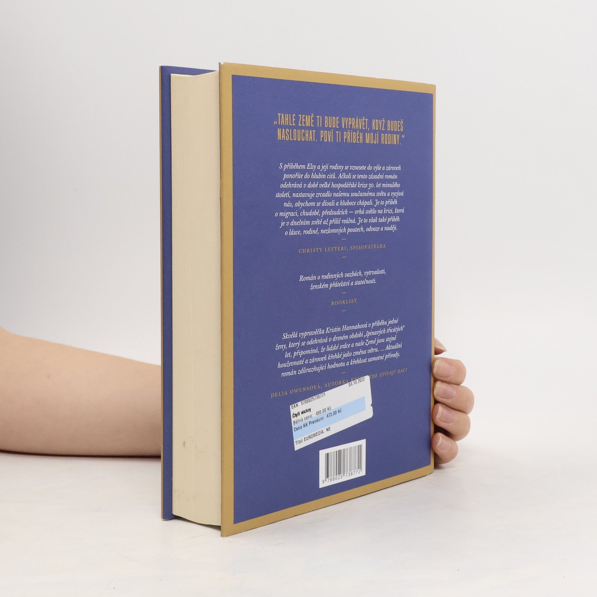 Texas, 1934. Velké planiny na hranici Spojených států amerických a Kanady sužuje tragické sucho. Miliony lidí jsou bez práce. Farmáři bojují o zachování své půdy i živobytí, plodiny však skomírají, voda vysychá a všechno halí oblaka dusivého prachu. Do životů místních lidí se s neodvratnou neúprosností prašné bouře přihnaly „Špinavé třicítky“, jedno z nejtemnějších období velké hospodářské krize. Doba je nejistá a nebezpečná, a tak je Elsa Martinelliová – stejně jako řada jejích sousedů – postavena před nelehkou volbu: zda dál bojovat o půdu, kterou miluje, nebo se vydat na západ, do Kalifornie, kde by mohla začít lepší život. Román Čtyři vichry představuje jedinečný portrét Ameriky a amerického snu v podání nezkrotné ženy, jejíž odvaha a sebeobětování se staly vzorem pro celou jednu generaci.