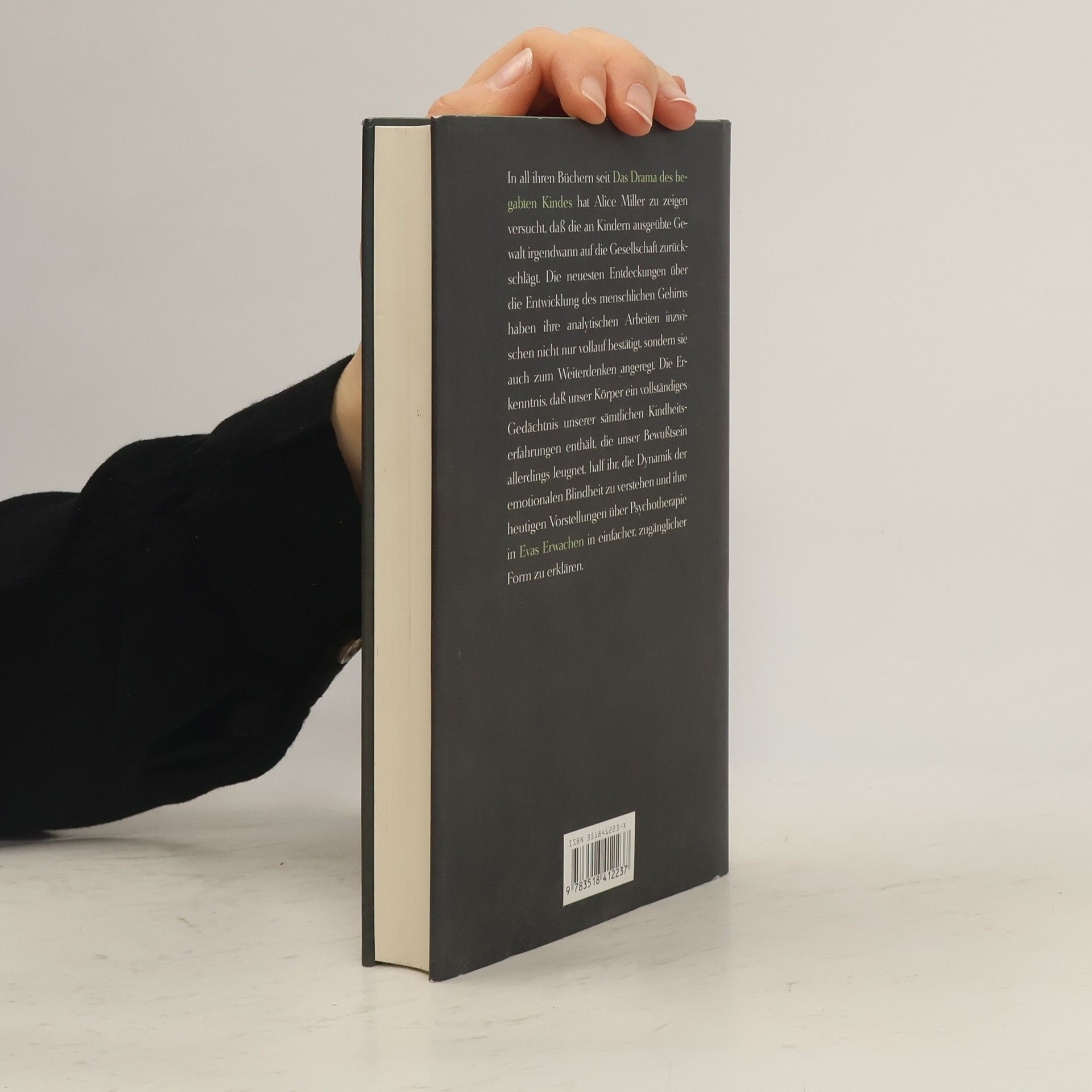 In all ihren Büchern seit Das Drama des begabten Kindes hat Alice Miller zu zeigen versucht, dass die an Kindern ausgeübte Gewalt irgendwann auf die Gesellschaft zurückschlägt. Die neuesten Entdeckungen über die Entwicklung des menschlichen Gehirns haben ihre analytischen Arbeiten inzwischen nicht nur vollauf bestätigt, sondern sie auch zum Weiterdenken angeregt. Die Erkenntnis, dass unser Körper ein vollständiges Gedächtnis unserer sämtlichen Kindheitserfahrungen enthält, die unser Bewusstsein allerdings leugnet, half ihr, die Dynamik der emotionalen Blindheit zu verstehen und ihre heutigen Vorstellungen über Psychotherapie in Evas Erwachen in einfacher, zugänglicher Form zu erklären.