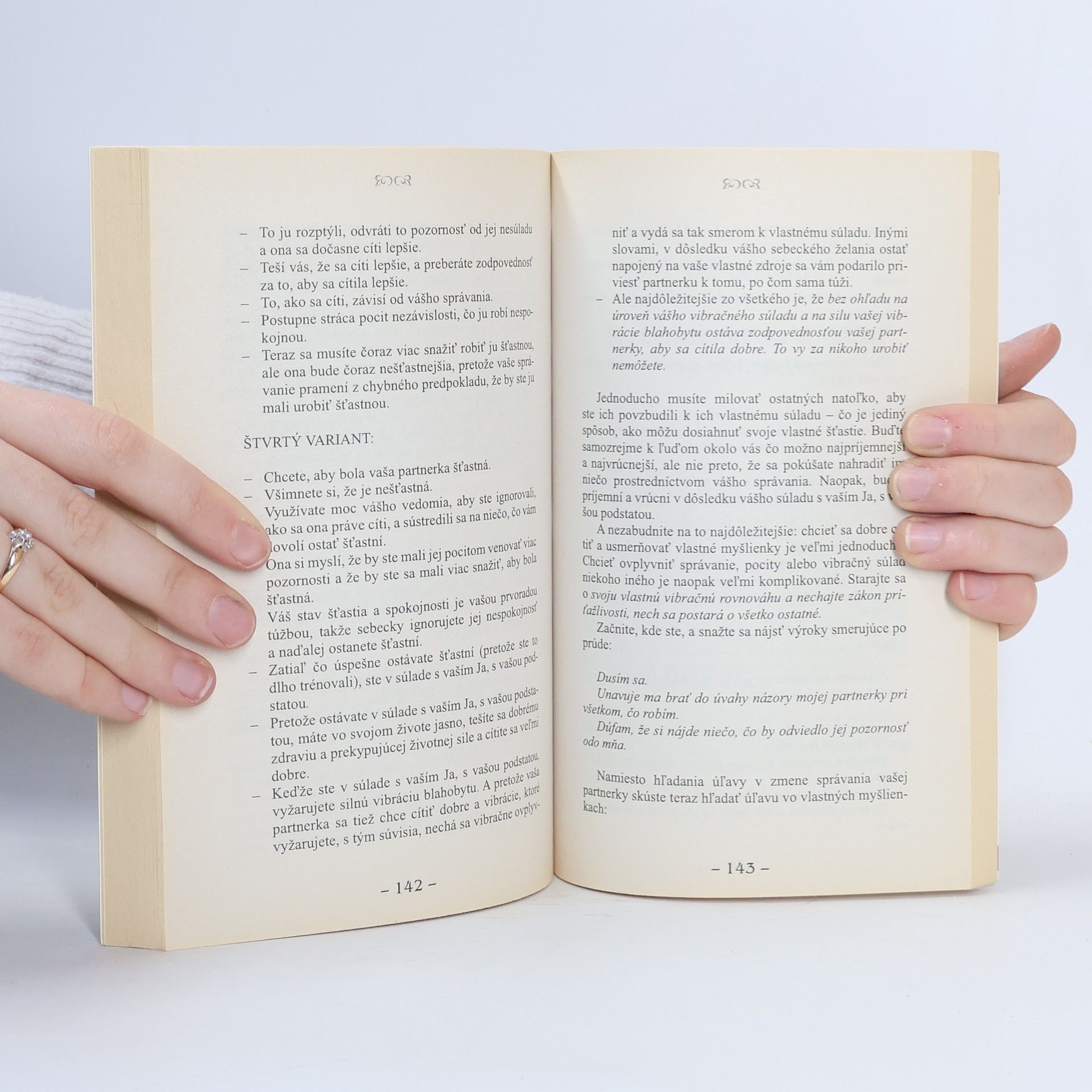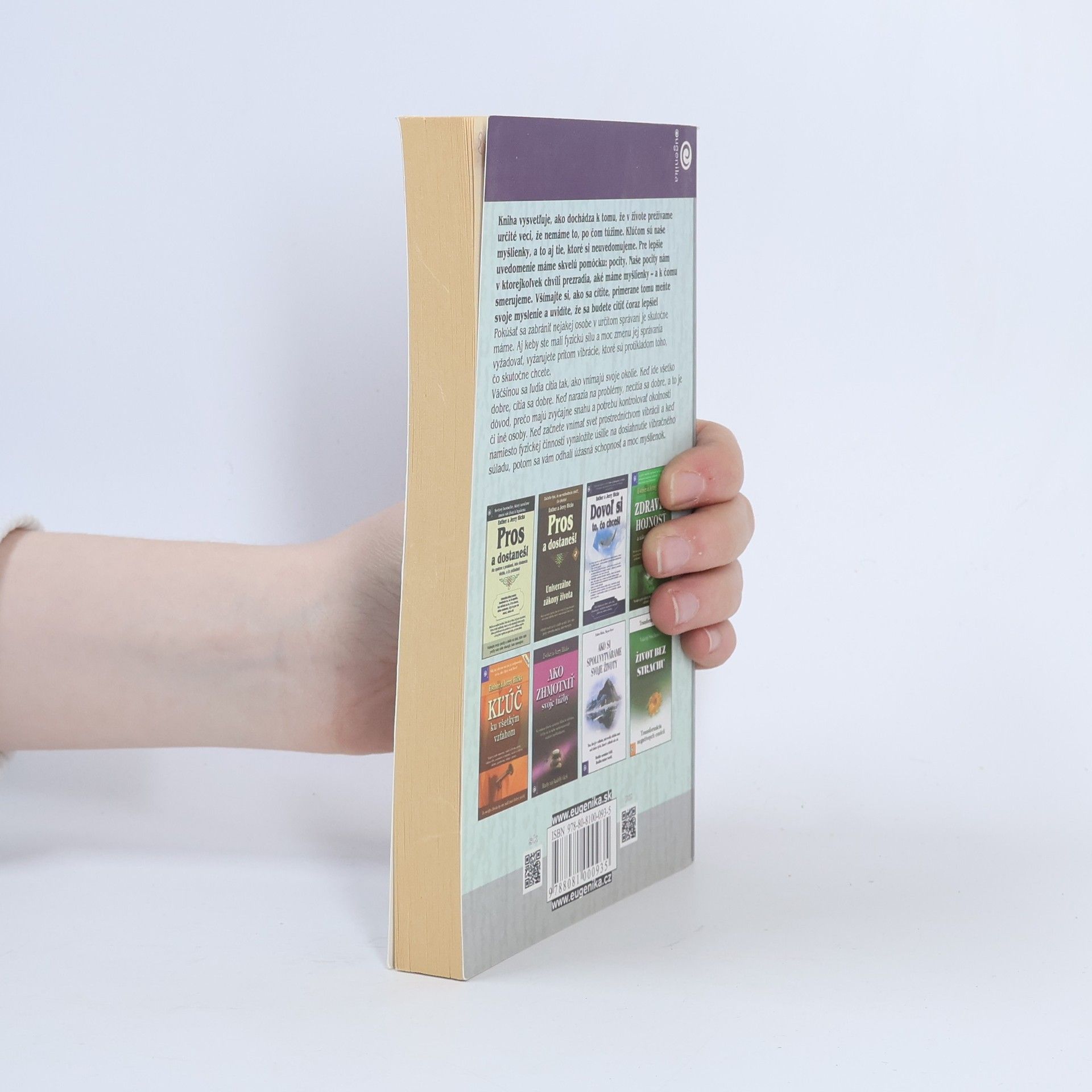 Už tretia kniha manželov Hicksovcov. Ich učenie vysvetľuje, ako dochádza k tomu, že v živote prežívame určité veci, že nemáme to, po čom túžime. Kľúčom sú naše myšlienky, a to aj tie, ktoré si neuvedomujeme. Pre lepšie uvedomenie máme skvelú pomôcku: pocity. Naše pocity nám v ktorejkoľvek chvíli prezradia, aké máme myšlienky - a k čomu smerujeme. Všímajte si, ako sa cítite, primerane tomu meňte svoje myslenie a uvidíte, že sa budete mat čoraz lepšie! Pokúšať sa zabrániť nejakej osobe v určitom správaní je skutočne márne. Aj keby ste mali fyzickú silu a moc zmenu jej správania vyžadovat, vyžarujete pritom vibrácie, ktoré sú protikladom toho, čo skutočne chcete. Väčšinou sa ľudia cítia tak, ako vnímajú svoje okolie. Keď ide všetko dobre, cítia sa dobre. Keď narazia na problémy, necítia sa dobre, a to je dôvod, prečo majú zvyčajne snahu a potrebu kontrolovat okolnosti či iné osoby. Chápeme, aké vzrušujúce je pre vás pokúšať sa o kontrolu okolnosti, pretože je to do istej miery možné prostredníctvom činnosti. Ale keď začnete vnímať svet prostredníctvom vibrácií a keď namiesto fyzickej činnosti vynaložíte úsilie na dosiahnutie vibračného súladu, potom sa vám odhalí úžasná schopnosť a moc myšlienok.