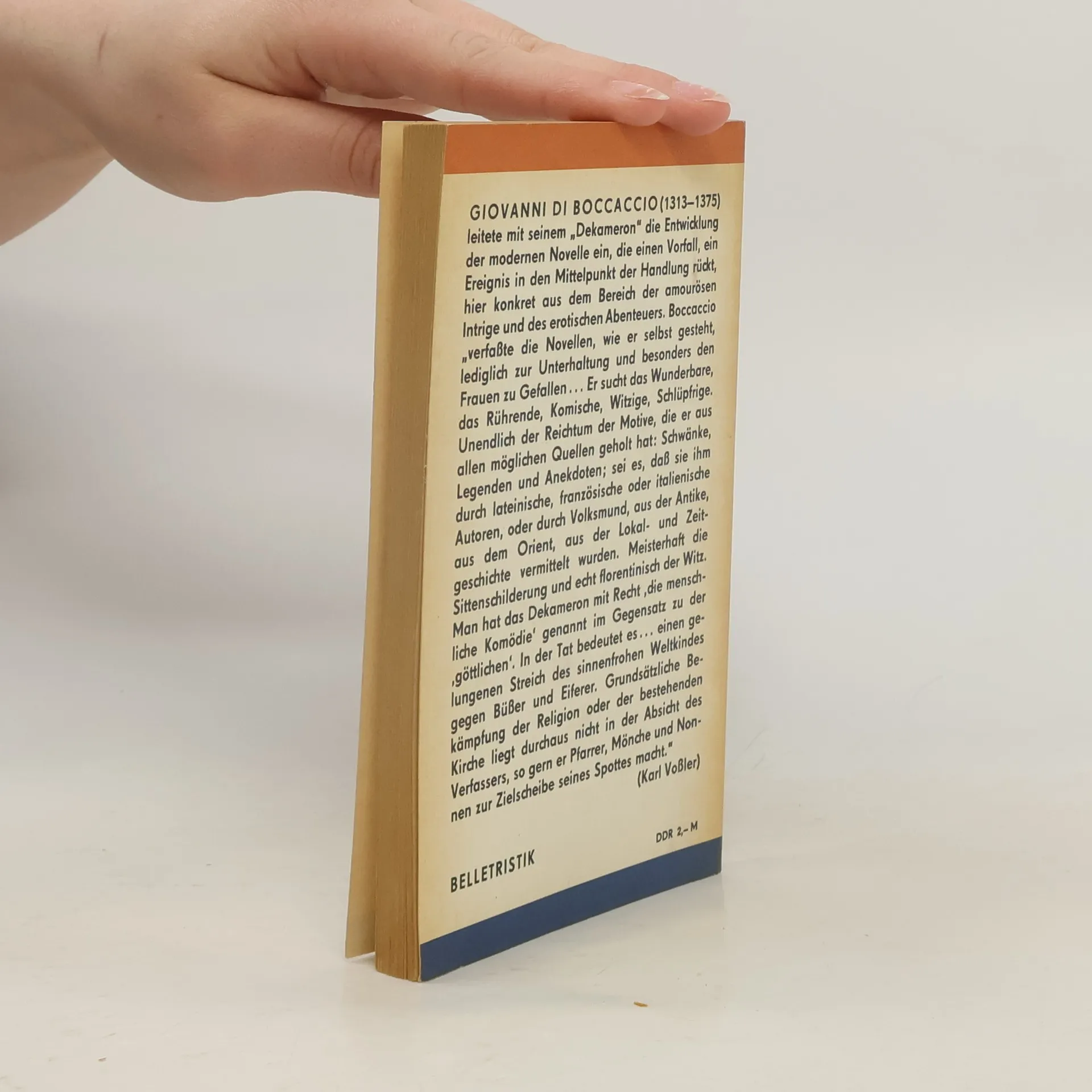 Das Dekameron, ein Novellenzyklus, den sich zehn Gäste eines bei Florenz gelegenen Landgutes während der Pestzeit erzählen, machte den Dichter weltberühmt. Andre Jolles schreibt in seiner Einleitung: »Wenige Bücher stehen in einem so schlechten Ruf - wenige sind so viel gelesen wie das Dekameron.«