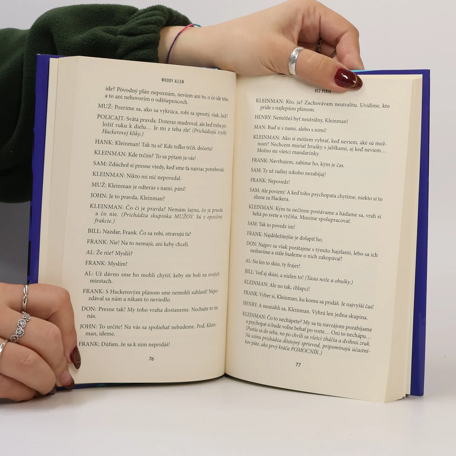 Druhá zbierka newyorského filmára, spisovateľa a hudobníka Woodyho Allena (*1935) Bez peria (Without Feathers, 1975) vychádza presne po štyridsiatich rokoch od vydania v Spojených štátoch pri príležitosti autorových osemdesiatin. V Amerike zožala veľký úspech – štyri mesiace figurovala v zozname bestsellerov denníka The New York Times –, no čitatelia na Slovensku si ju doteraz mohli prečítať len v českom preklade.