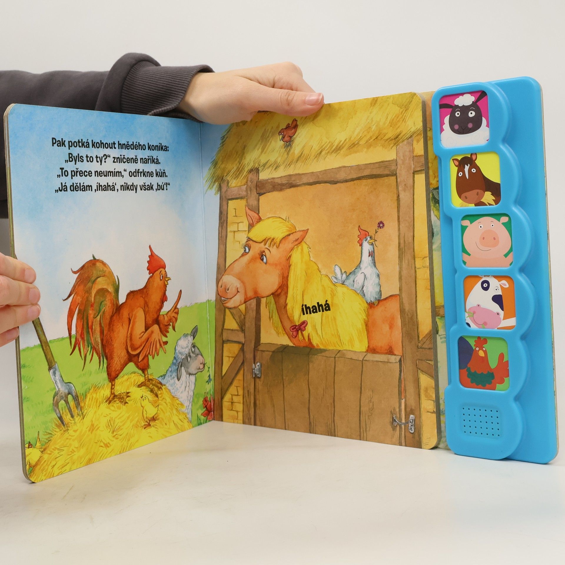 Kdo to budí zvířátka je kniha se zvuky. Vypátrej společně s kohoutekem, kdo to ráno budil zvířátka na farmě!