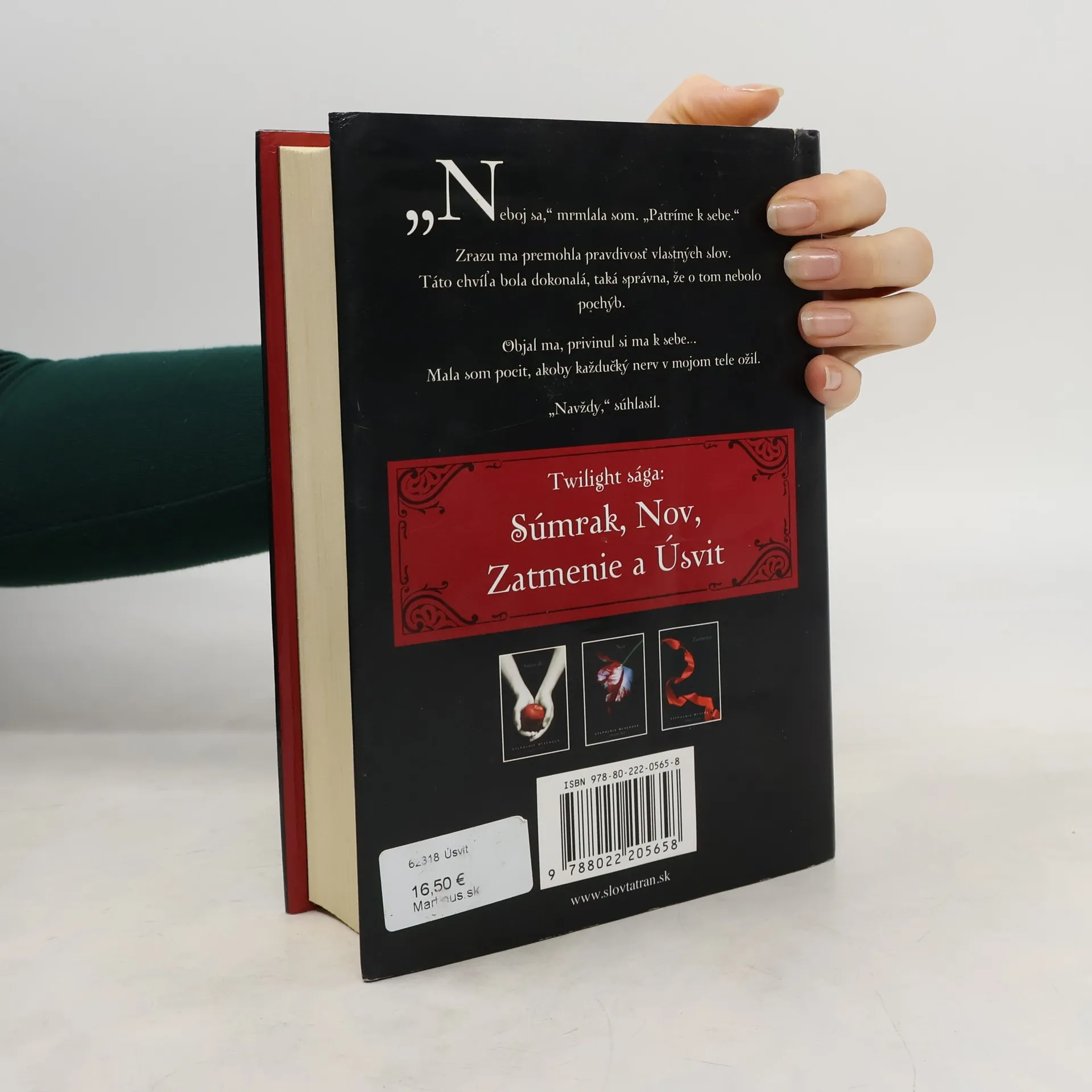 Keď milujete toho, kto vás zabíja, nemáte na výber. Ako by ste mohli utiecť, ako by ste mohli bojovať, keby ste práve tým ublížili niekomu, koho milujete? Ak mu nemáte dať nič viac a nič menej ako vlastný život, ako by ste mu ho mohli odoprieť? Niekomu, koho skutočne milujete? Bella Swanová je neodvolateľne zaľúbená do upíra – je to pre ňu krásny sen a zároveň nočná mora, ktoré vytvárajú jej nebezpečne vyhrotenú realitu. Na jednu stranu ju ťahá silná vášeň, ktorú cíti k Edwardovi Cullenovi a na druhú hlboké puto k vlkolakovi Jacobovi Blackovi a prežila búrlivý rok plný pokušenia, strát a sporov, kým dospela k rozhodujúcemu okamihu. Rozhodne sa teraz vstúpiť do temného, no zvodného sveta nesmrteľných, alebo bude pokračovať v ľudskom živote? Od odpovede na túto otázku závisí osud dvoch kmeňov. Keď sa Bella už raz rozhodla, začína sa prekvapivý sled nevídaných udalostí s potenciálne ničivými a tajomnými dôsledkami. Práve keď sa zdá, že sa zamotané pradivá Bellinho života – ktoré sa po prvý raz objavili v Súmraku, potom sa zamotali a potrhali v Nove a Zatmení – znova rozpletú a usporiadajú, mohli by byť zničené... navždy? Úsvit, úžasný a s napätím očakávaný záver ságy Twilight, odhaľuje tajomstvá a záhady tohto fascinujúceho romantického eposu, ktorý okúzlil milióny čitateľov.
