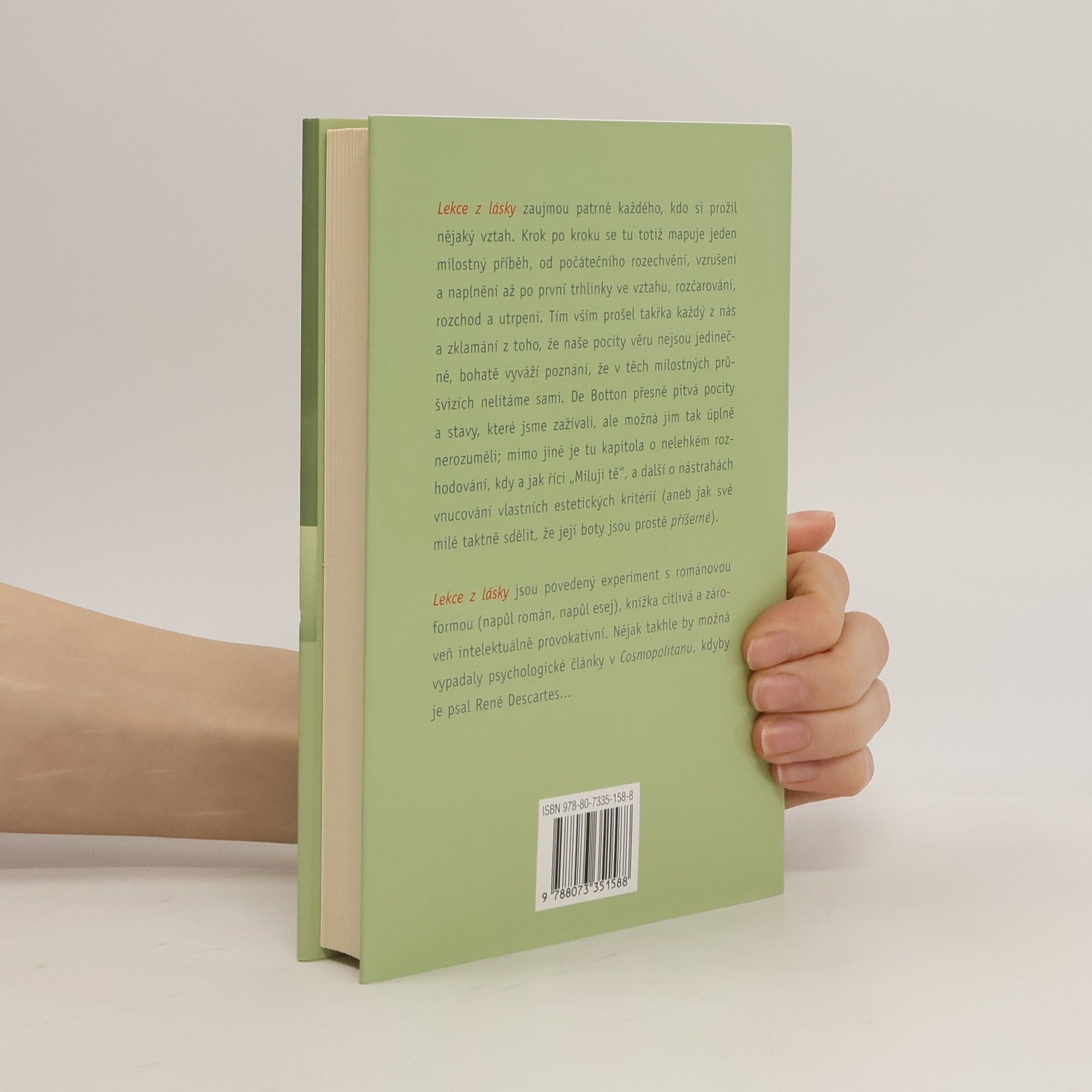 „Lekce z lásky“ zaujmou patrně každého, kdo si prožil nějaký vztah. Krok po kroku se tu totiž mapuje jeden milostný příběh, od počátečního rozechvění, vzrušení a naplnění až po první trhlinky, rozčarování, rozchod a utrpení. To vše takřka každý z nás prožil a zklamání z toho, že naše pocity věru nejsou jedinečné, bohatě vyváží poznání, že v milostných průšvizích nelítáme sami. De Botton přesně vystihuje a rozebírá pocity a stavy, které jsme zažívali, ale možná jim tak úplně nerozuměli; mimo jiné je tu kapitola o nelehkém rozhodování, kdy a jak říci „Miluji tě“, a další o nástrahách vnucování vlastních estetických kriterií (aneb jak své milé taktně sdělit, že její boty jsou prostě příšerné). Lekce z lásky jsou povedený experiment s románovou formou (napůl román, napůl esej), knížka citlivá a zároveň intelektuálně provokativní. Nějak takhle by možná vypadaly psychologické články v Cosmopolitanu, kdyby je psal René Descartes...