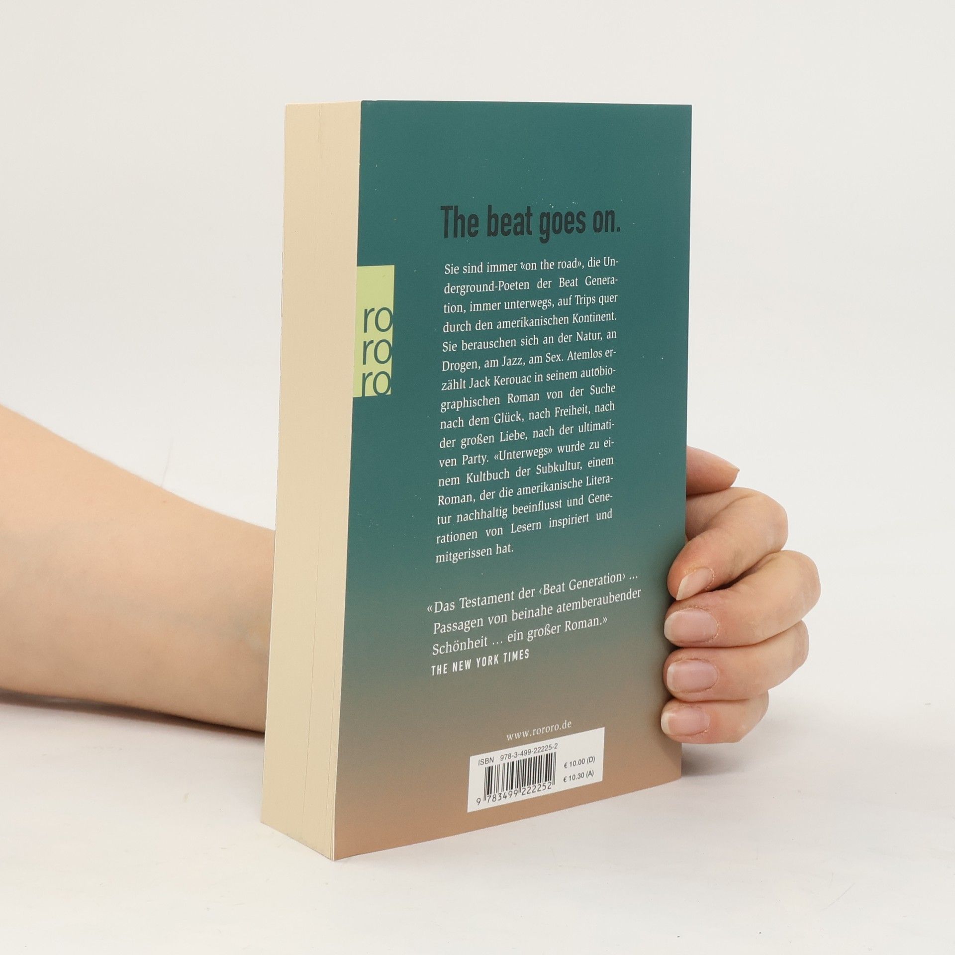 The Beat goes onSie sind immer «on the road», die Underground-Poeten der Beat Generation, immer unterwegs, auf Trips quer durch den amerikanischen Kontinent. Sie berauschen sich an der Natur, an Drogen, am Jazz, am Sex. Atemlos erzählt Jack Kerouac in seinem autobiografischen Roman von der Suche nach dem Glück, nach Freiheit, nach der großen Liebe, nach der ultimativen Party. «Unterwegs» wurde zu einem Kultbuch der Subkultur, einem Roman, der die amerikanische Literatur nachhaltig beeinflusst und Generationen von Lesern inspiriert und mitgerissen hat. «Das Testament der ‹Beat Generation› ... Passagen von beinahe atemberaubender Schönheit … ein großer Roman.» (The New York Times)