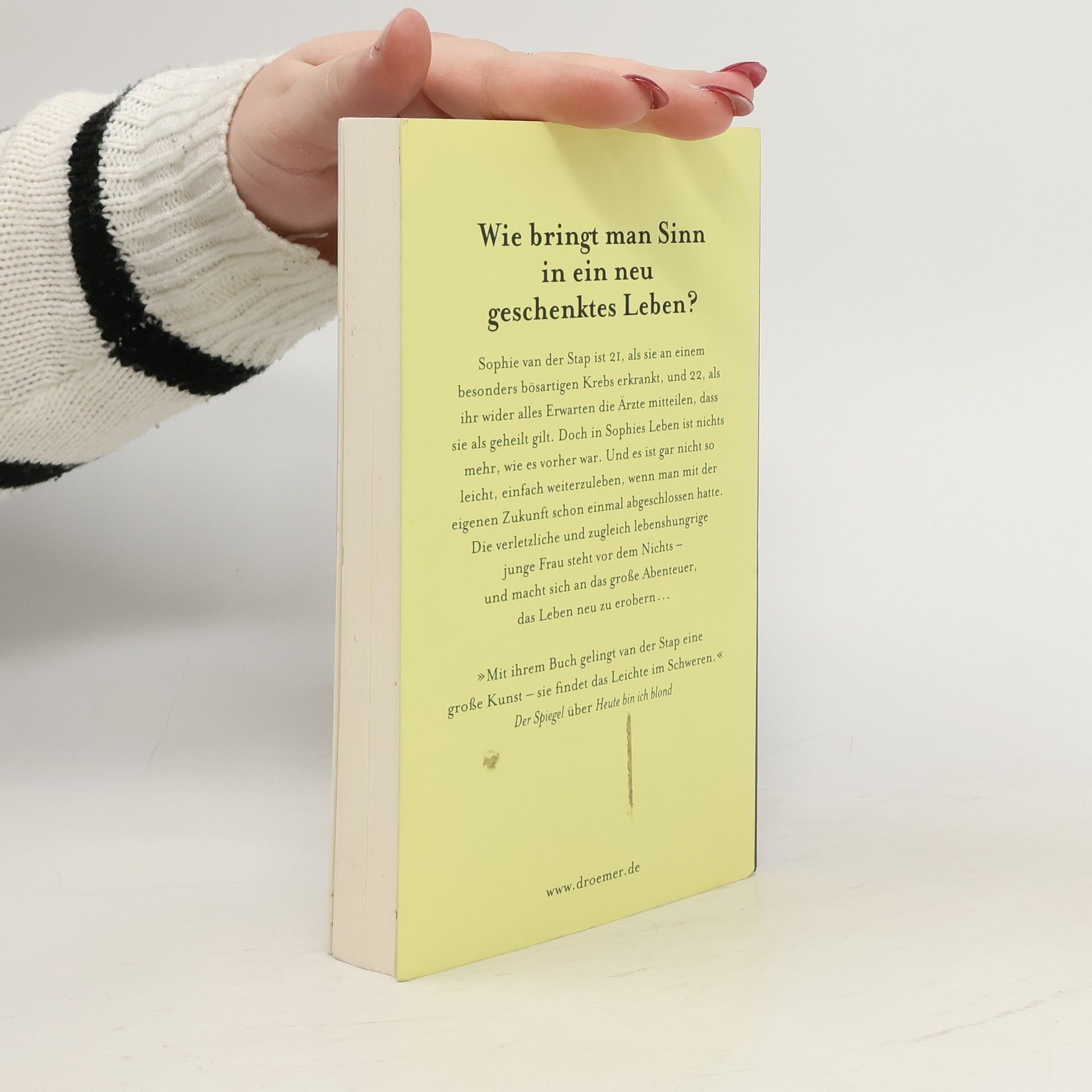 Geheilt. Doch wirkliches Glück kann Sophie nicht empfinden, denn es hat sich ein Loch aufgetan, wo ihre Zukunftsträume waren. Und wie soll sie damit umgehen, dass ihre Freundin Chantal den Krebs nicht überleben wird? Sophie ergreift die Flucht nach vorn: Sie begibt sich auf eine Reise um die Welt, auf der Suche nach sich selbst. »Ich stehe vor einem leeren Raum, am Fuße eines Neubeginns, ohne Haken in der Wand. Und die einzige Person, die den Raum füllen kann, bin ich.«