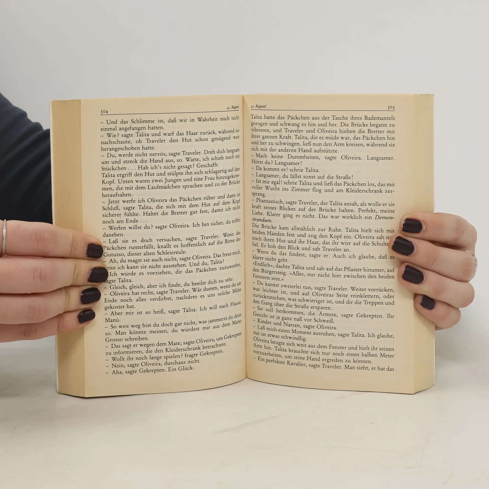 „Der Stoff, aus dem Cortázar diesen Labyrinth-Traum von einem wundersamen und herrlich gewitzten Buch knetet, ist fast bieder und einfach: Ein Boheme-Zirkel im Paris der fünfziger Jahre, Schriftsteller, Künstler, verkrachte Genies aus verschiedener Herren Länder und deren Freundinnen; Gespräche über Kultur und Philosophie, Liebe und Jazz. Der ›Klub der Schlange‹ wird von dem Mate trinkenden Oliveira, einem Argentinier, und seiner Freundin ›Maga‹ dominiert. Sie kommt aus Uruguay; für den geistig gespaltenen, zynischen Freund ist sie so etwas wie die Unschuld des Lebens, sinnliche Identität. Aber er verliert sie (wie, warum, ja, das müssen Sie schon lesen). Der Klub zerfällt, Maga verschwindet, und Oliveira, von der Polizei bei einem öffentlichen Sexualakt mit einer Clocharde ertappt, wird ausgewiesen. Zurück in Buenos Aires, trifft er seinen alten Freund Traveler wieder, in dessen Frau imaginiert er sich sehnsüchtig seine Maga. Zuerst im Zirkus beschäftigt, treffen wir die drei zuletzt als Bedienstete und Wärter eines privaten Irrenhauses und den immer tiefer in seine Wünsche verstrickten Oliveira schließlich als Patienten, der sich von einer Fensterbrüstung stürzt ...