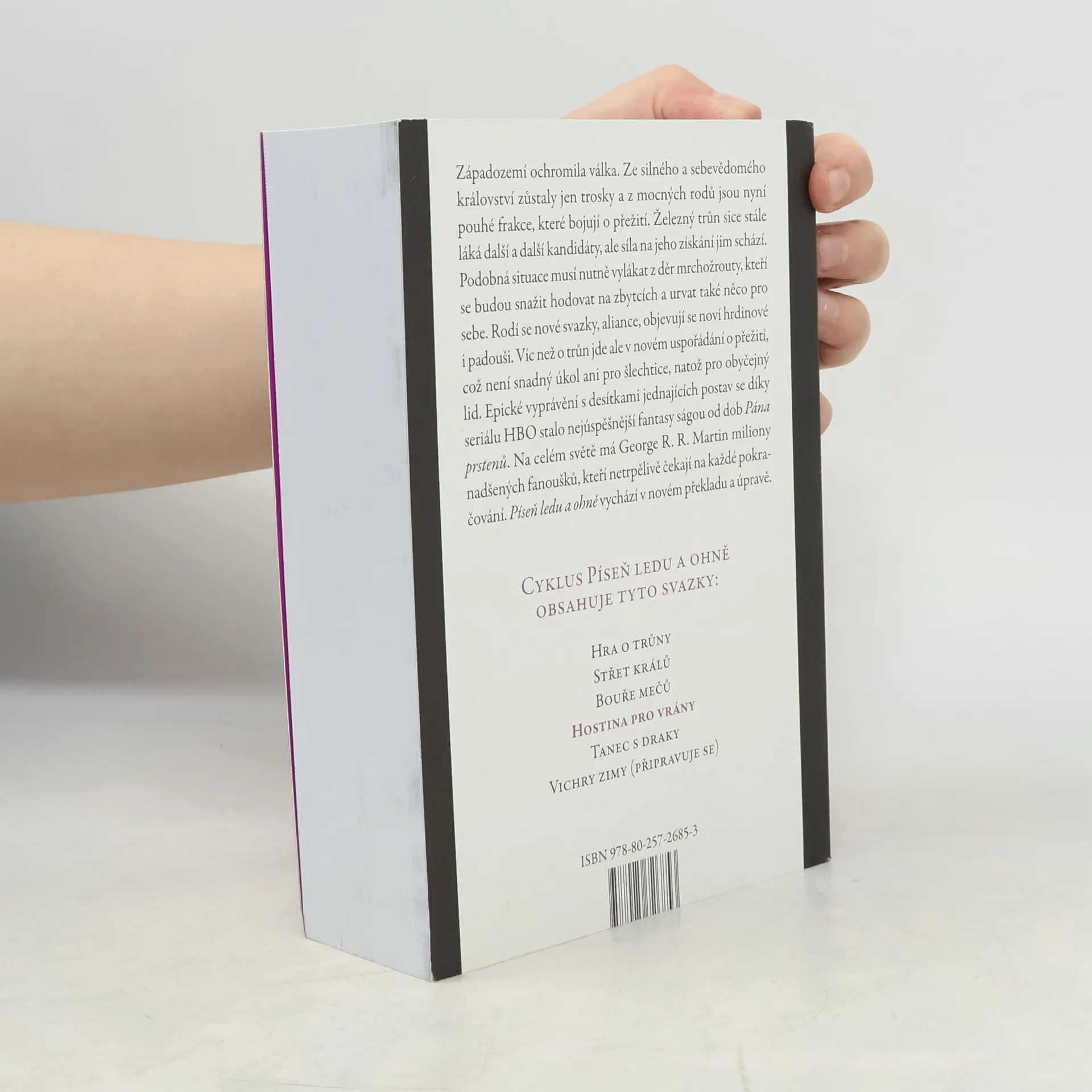 Západozemí ochromila válka. Ze silného a sebevědomého království zůstaly jen trosky a z mocných rodů jsou nyní pouhé frakce, které bojují o přežití. Železný trůn sice stále láká další a další kandidáty, ale síla na jeho získání jim schází. Podobná situace musí nutně vylákat z děr mrchožrouty, kteří se budou snažit hodovat na zbytcích a urvat také něco pro sebe. Rodí se nové svazky, aliance, objevují se noví hrdinové i padouši. Víc než o trůn jde ale v novém uspořádání o přežití, což není snadný úkol ani pro šlechtice, natož pro obyčejný lid. Epické vyprávění s desítkami jednajících postav se díky seriálu HBO stalo nejúspěšnější fantasy ságou od dob Pána prstenů. Na celém světě má miliony nadšených fanoušků, kteří netrpělivě čekají na každé pokračování. Píseň ledu a ohně vychází v novém překladu a úpravě.