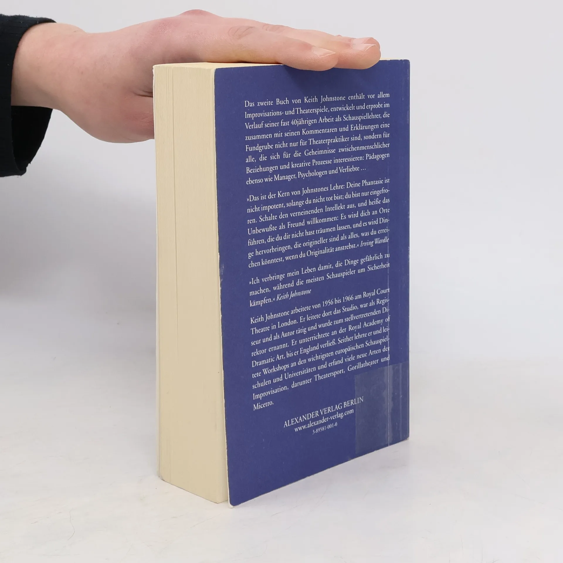 Das zweite Buch Johnstones enthält vor allem Improvisations- und Theaterspiele, entwickelt und erprobt im Verlauf seiner 40jährigen Arbeit als Schauspiellehrer, die zusammen mit seinen Kommentaren und Erklärungen eine Fundgrube nicht nur für Theaterpraktiker sind, sondern für alle, die sich für die Geheimnisse zwischenmenschlicher Beziehungen und kreative Prozesse interessieren. Ein Motto von Johnstone: 'Ich verbringe mein Leben damit, die Dinge gefährlich zu machen, während die meisten Schauspieler um Sicherheit kämpfen.' Keith Johnstone: 'Unter vernünftigen Bedingungen kann der Theatersport: 1. die universelle Angst vor dem Angestarrtwerden vermindern 2. ›stumpfsinnige‹ Leute in brillante Leute verwandeln 3. zwischenmenschliche Fähigkeiten verbessern und zu einer lebenslangen Beschäftigung mit menschlicher Interaktion ermuntern 4. das ›Funktionieren‹ auf allen Gebieten verbessern (wie es auf Schlangenölfläschchen immer heißt) 5. die Fähigkeit, Geschichten zu erzählen, entwickeln (Geschichten sind wichtiger, als es den meisten bewußt ist) 6. den Schüler sowohl mit dem Innenleben als auch der Oberfläche des Theaters vertraut machen.'