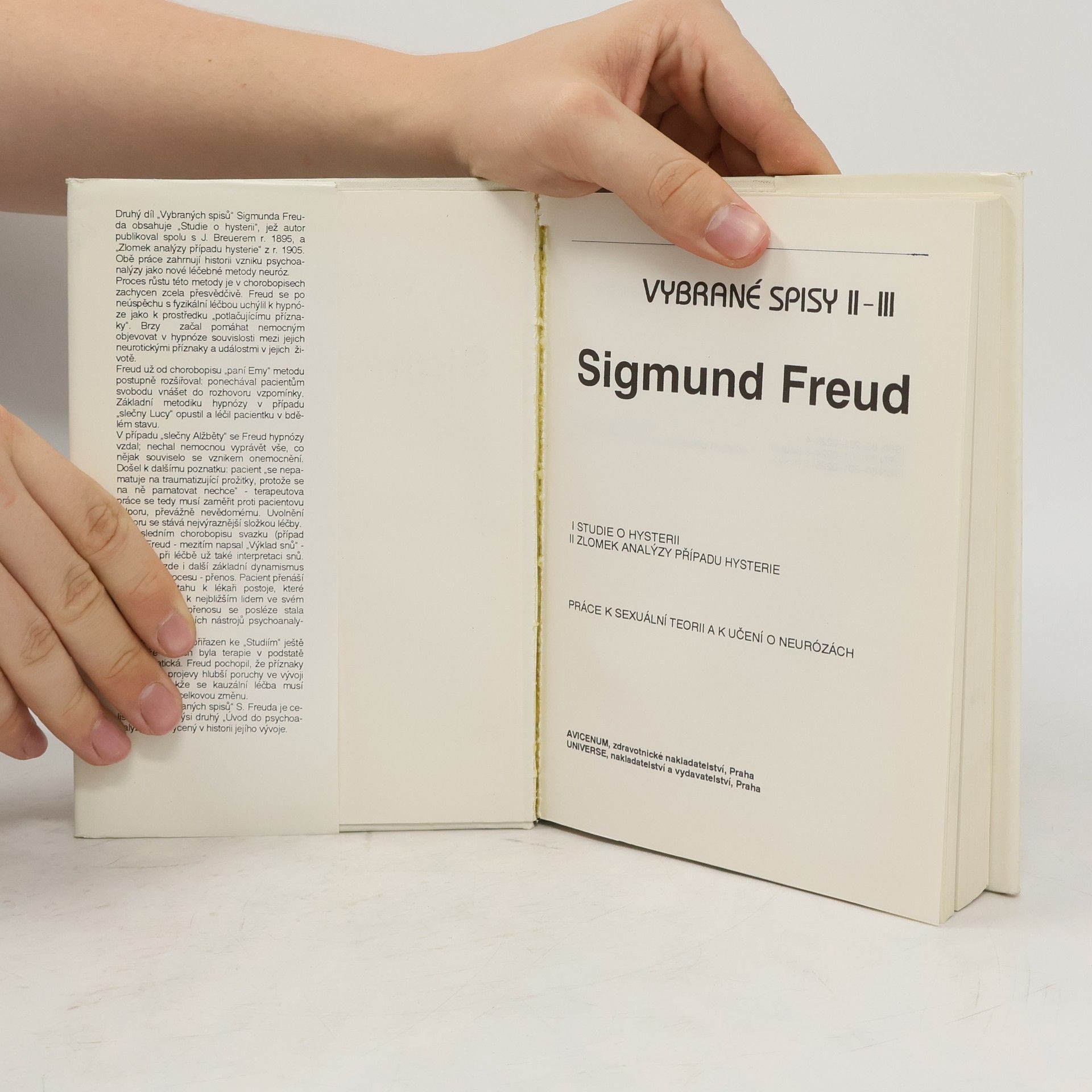 Vybrané spisy II. 1. Studium o hysterii - Předmluva k prvnímu vydání; - Předmluva k druhému vydání - (přeložil Bohodar Dosužkov) - O psychickém mechanismu hysterických jevů (předběžné sdělení) - přeložil Bohodar Dosužkov - Chorobopisy : A) Paní Ema z N.; B) Miss Lucy R. - oba chorobopisy přeložil Otakar Kučera C) Kateřina - přeložil Karel Kopřiva; D) Slečna Alžběta z R. - přeložil Jaroslav Vácha - K psychoterapii hysterie, Poznámky k případu Anny O. 2. Zlomek analysy případu hysterie - Předmluva; Stav choroby; První sen; Druhý sen; Doslov; Bibliografická poznámka; Rejstřík Vybrané spisy III. Práce k sexuální teorii Práce k učení o neurózách Práce k psychoanalytické technice... celý text