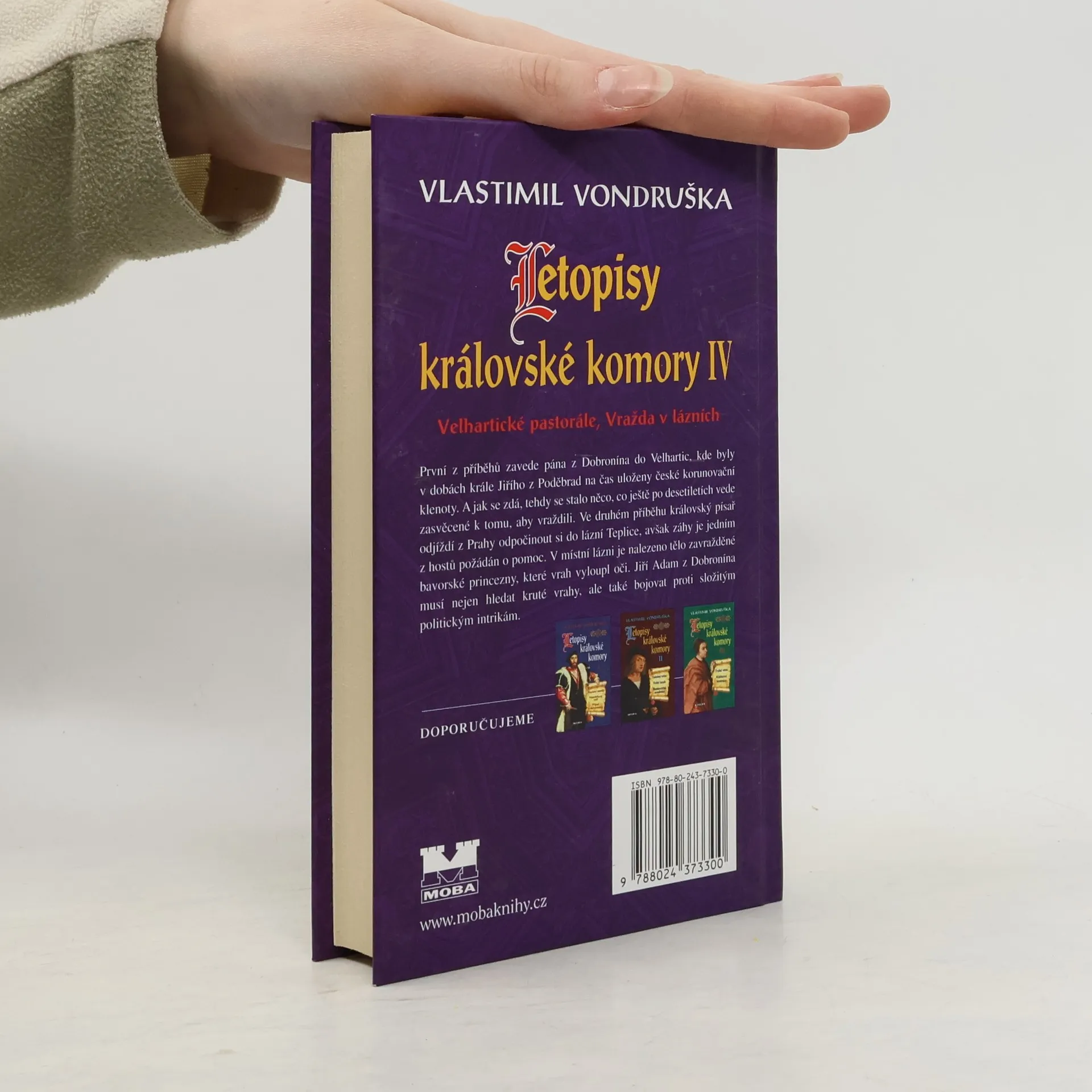 První z příběhů zavede pána z Dobronína do Velhartic, kde byly v dobách krále Jiřího z Poděbrad na čas uloženy české korunovační klenoty. A jak se zdá, tehdy se stalo něco, co ještě po desetiletích vede zasvěcené k tomu, aby vraždili. Ve druhém příběhu královský písař odjíždí z Prahy odpočinout si do lázní Teplice, avšak záhy je jedním z hostů požádán o pomoc. V místní lázni je nalezeno tělo zavražděné bavorské princezny, které vrah vyloupl oči. Jiří Adam z Dobronína musí nejen hledat kruté vrahy, ale také bojovat proti složitým politickým intrikám.