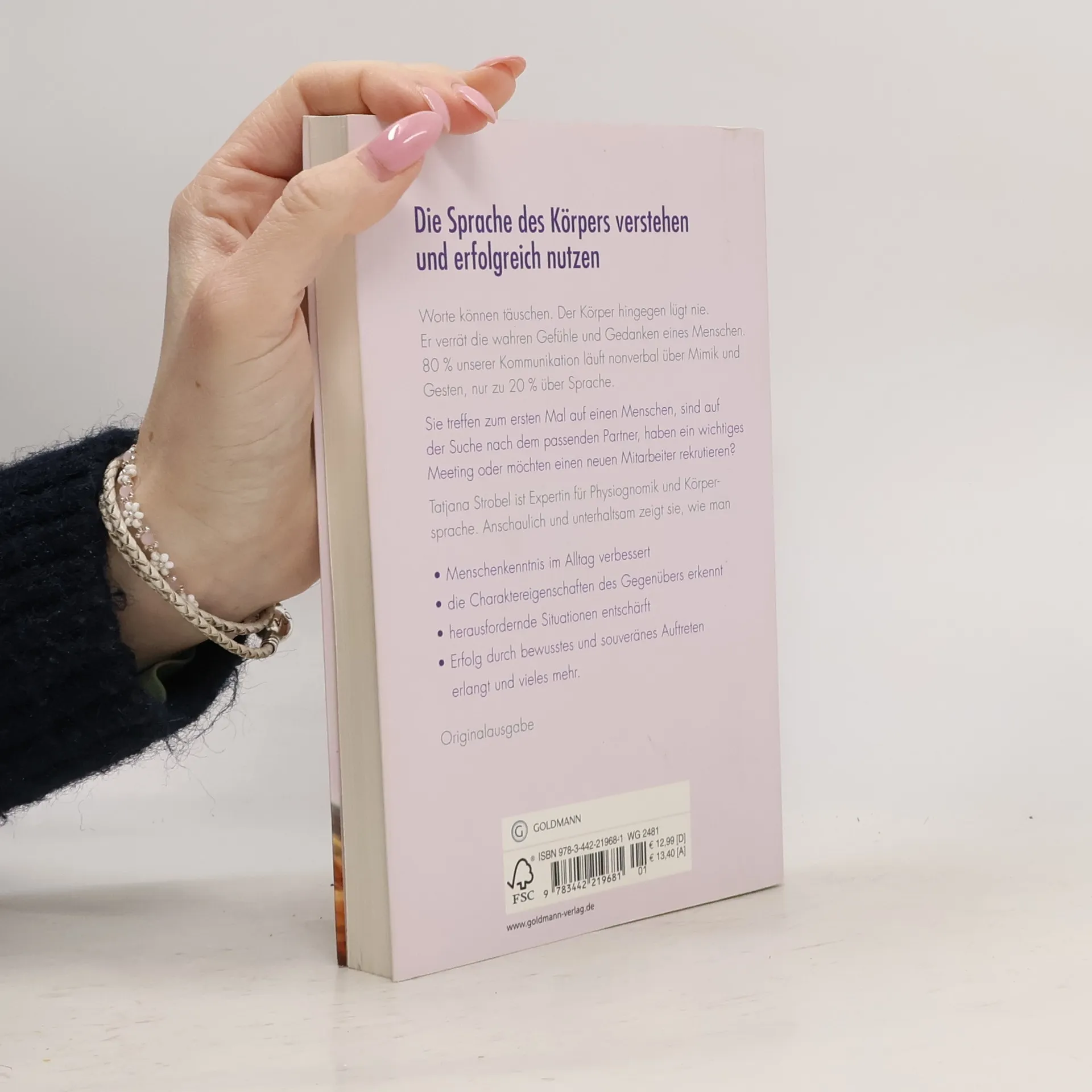 Die Sprache des Körpers verstehen und erfolgreich nutzenJeder Gedanke ist Gehirnaktivität und wird über die Muskulatur in unseren Bewegungen zum Ausdruck gebracht. Bevor wir etwas sagen, haben wir unsere Gedanken und Gefühle bereits zu 90% preisgegeben, und zwar durch Gestik und Körpersprache. Aber auch Hand-, Fuß- und Fingerformen offenbaren die Charaktereigenschaften und Neigungen eines Individuums. Tatjana Strobel ist Expertin für Physiognomik und Körpersprache. Schritt für Schritt erklärt sie, was sich hinter bestimmten Gesten, Haltungen und Formen verbirgt. So wird es gelingen, die faszinierende Sprache des Körpers zu verstehen und uns selbst und andere besser einzuschätzen.
