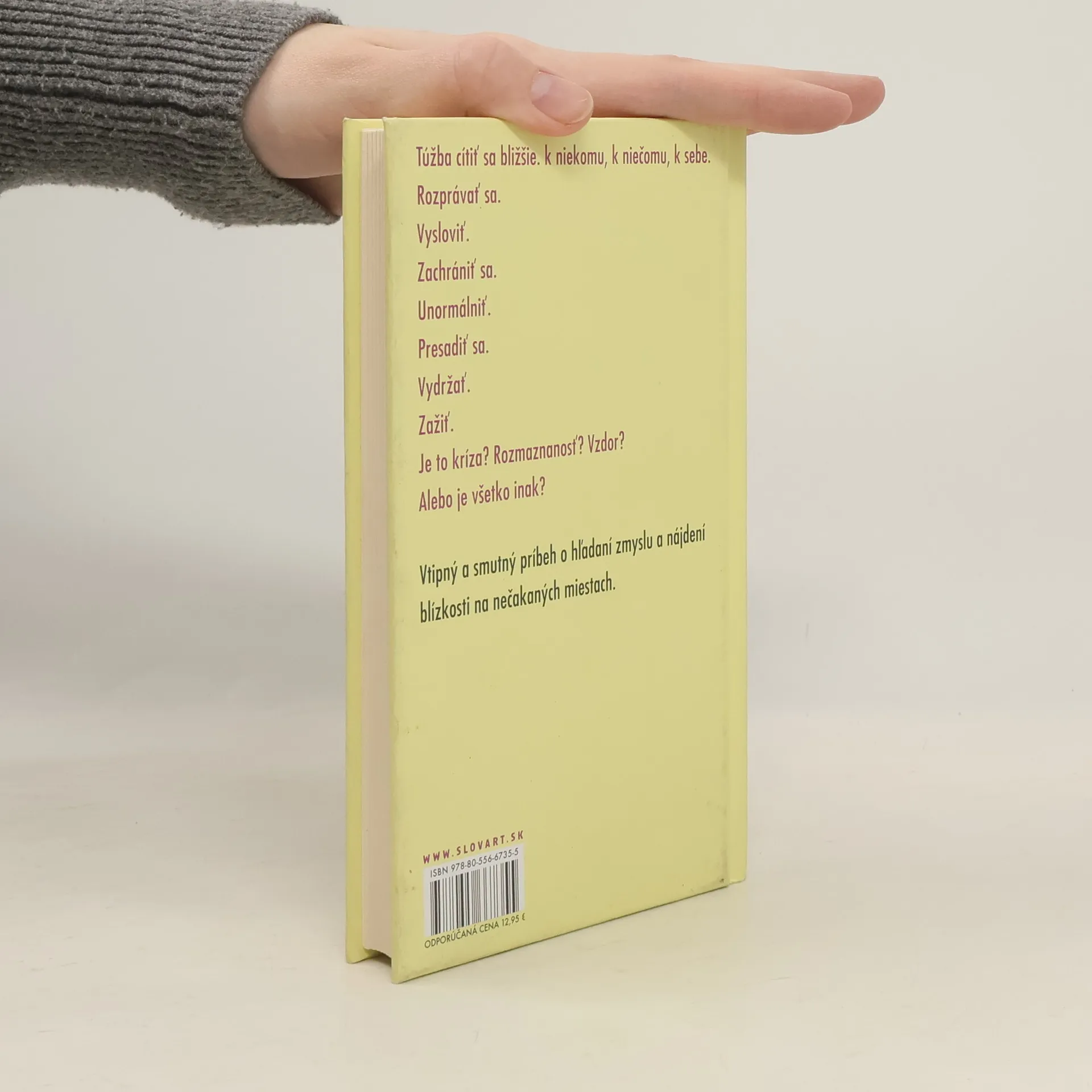 Túžba cítiť sa bližšie. K niekomu, k niečomu, k sebe. Rozprávať sa. Vysloviť. Zachrániť sa. Unormálniť. Presadiť sa. Vydržať. Zažiť. Je to kríza? Rozmaznanosť? Vzdor? Alebo je všetko inak? Vtipný a smutný príbeh o hľadaní zmyslu a nájdení blízkosti na nečakaných miestach. -- page 4 of cover