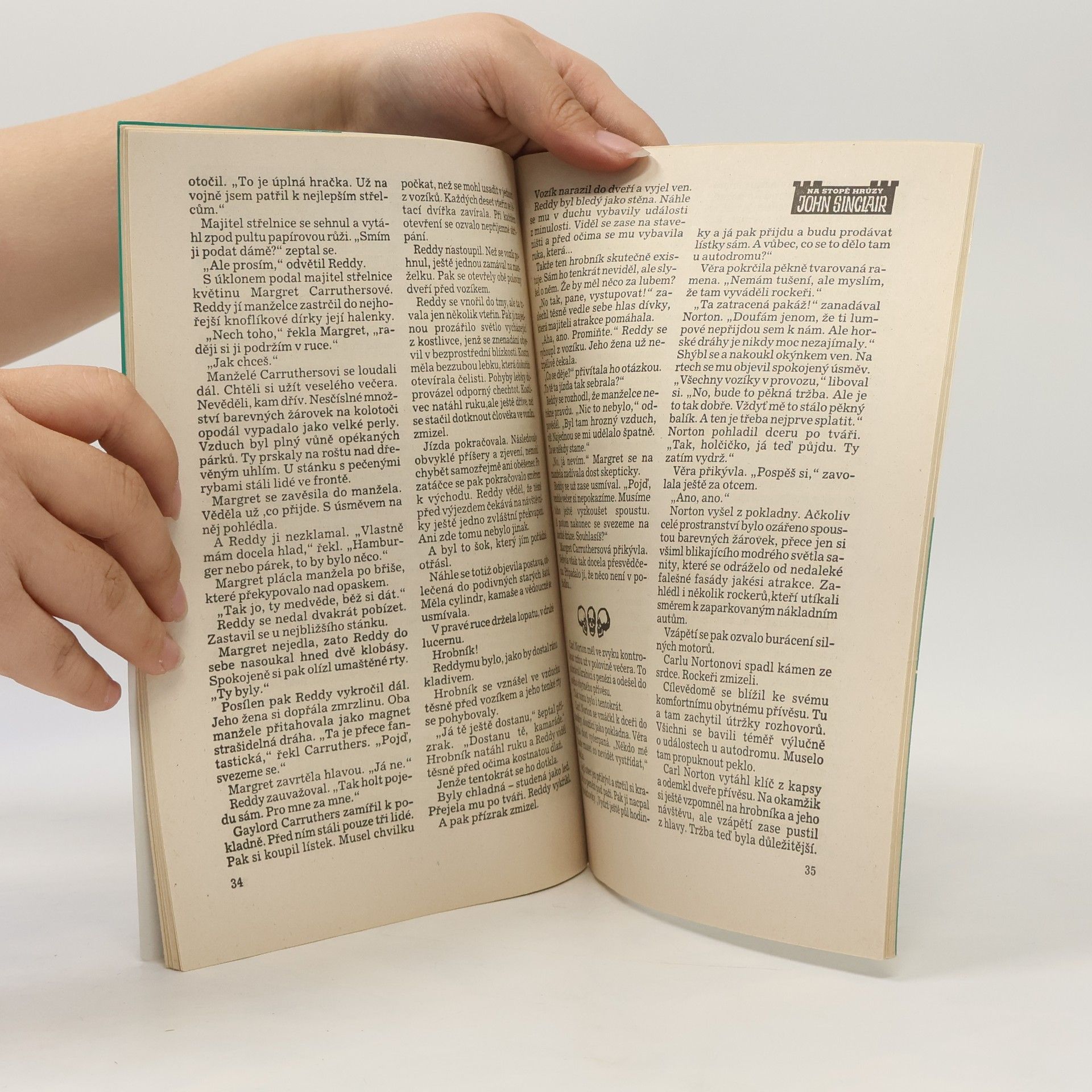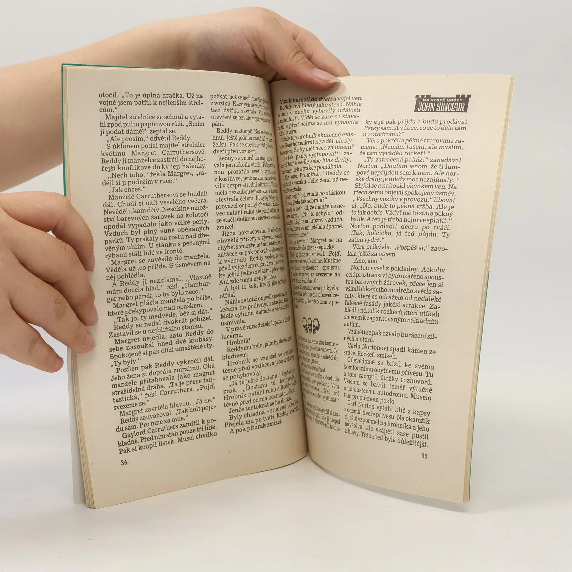 Plácek s atrakcemi znamenal hotovou senzaci! Už celé týdny se na ni obyvatelé okolních vesnic těšili. A pak přišel den otevření. Lidé tam proudili v celých davech. Muži, ženy, děti. . Všude to kypělo radostí ze života.Nikdo ani nepomys- . lel na varování příšerného hrobníka. Ten číhal ve skrytu a čekal na svou šanci, až bude moci udeřit. Chtěl proměnit celý plácek v jeden hromadný hrob.