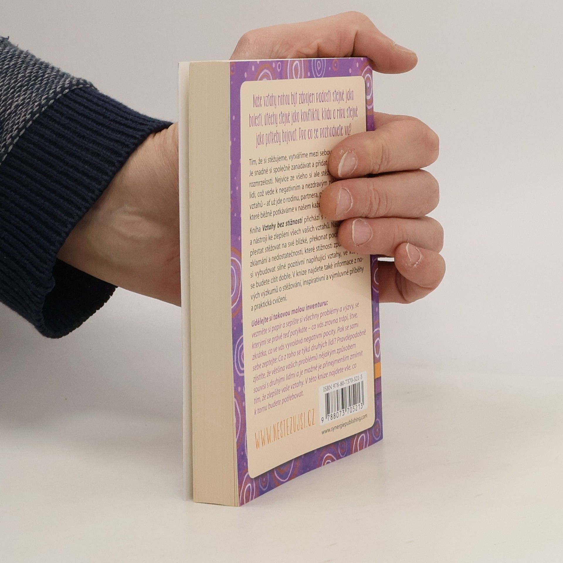 Tím, že si stěžujeme, vytváříme mezi sebou určité spojení. Je snadné si společně zanadávat a přidat se ke všeobecné rozmrzelosti. Nejvíce ze všeho si ale stěžujeme na druhé lidi, což vede k negativním a nezdravým základům našich vztahů – ať už jde o rodinu, partnera, přátele nebo další lidi, které běžné potkáváme v našem každodenním životě. Kniha Vztahy bez stížností přichází s revolučními vhledy a nástroji ke zlepšení všech vašich vztahů. Naučíte se, jak si přestat stěžovat na své blízké, překonat pocity prázdnoty, zklamání a nedostatečnosti, které stížnosti způsobují, a jak si vybudovat silné pozitivní naplňující vztahy, ve kterých se budete cítit dobře. V knize najdete také informace z nových výzkumů o stěžování, inspirativní a výmluvné příběhy a praktická cvičení. Více na http://nestezujsi.cz/ „Udělejte si takovou malou mentální inventuru: vezměte si papír a sepište si všechny problémy a výzvy, se kterými se právě teď potýkáte – co vás zrovna trápí, štve, zkrátka, co ve vás vyvolává negativní pocity. Pak se sami sebe zeptejte: Co z toho se týká druhých lidí? Pravděpodobně zjistíte, že většina vašich problémů nějakým způsobem souvisí s druhými lidmi a je možné je přinejmenším zmírnit tím, že zlepšíte vaše vztahy. V této knize najdete vše, co k tomu budete potřebovat.“