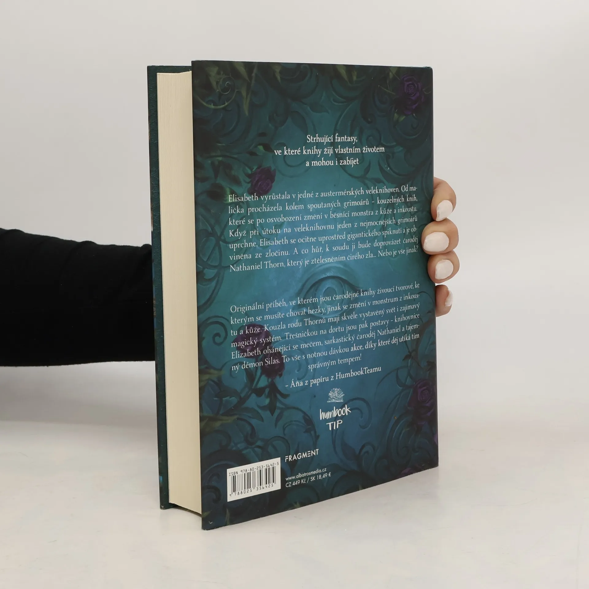 Strhující fantasy, ve které knihy žijí vlastním životem a mohou i zabíjet. Elisabeth vyrůstala v jedné z austermérských veleknihoven. Od malička procházela kolem spoutaných grimoárů – kouzelných knih, které se po osvobození změní v běsnící monstra z kůže a inkoustu. Když při útoku na veleknihovnu jeden z nejmocnějších grimoárů uprchne, Elisabeth se ocitne uprostřed gigantického spiknutí a je obviněna ze zločinu. A co hůř, k soudu ji bude doprovázet čaroděj Nathaniel Thorn, který je ztělesněním čirého zla… Nebo je vše jinak?