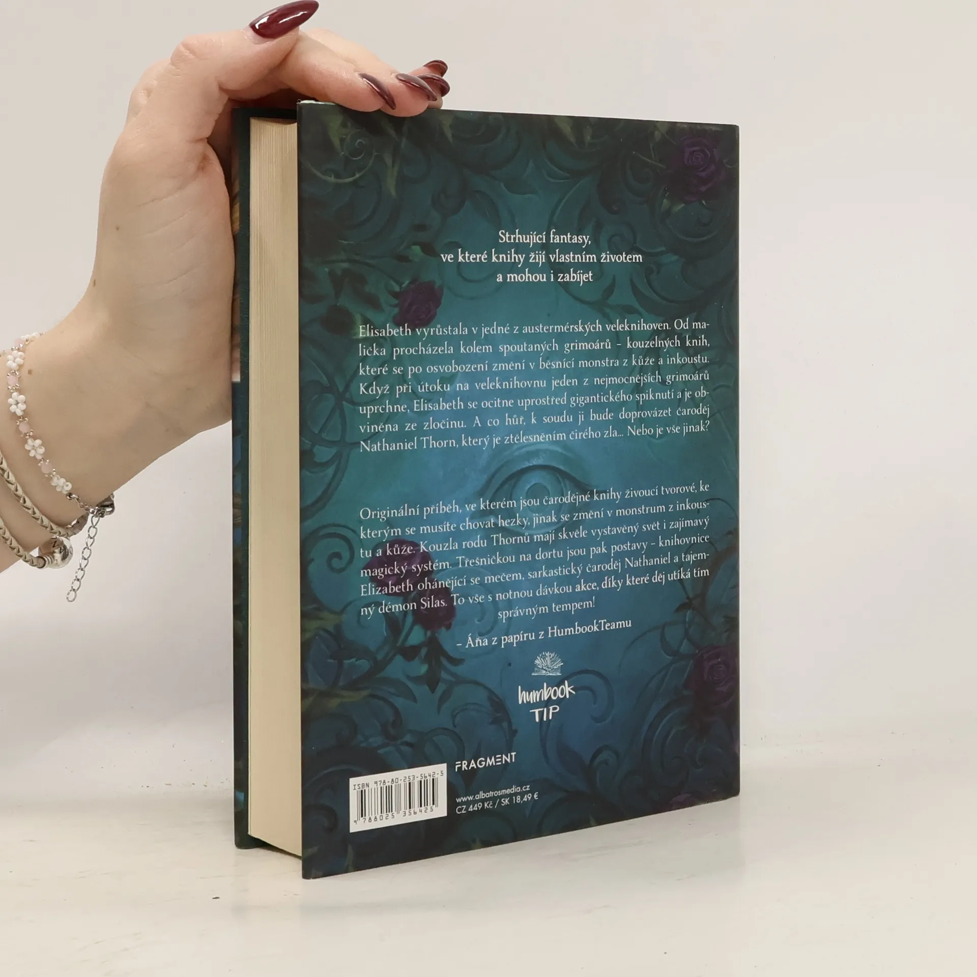 Strhující fantasy, ve které knihy žijí vlastním životem a mohou i zabíjet. Elisabeth vyrůstala v jedné z austermérských veleknihoven. Od malička procházela kolem spoutaných grimoárů – kouzelných knih, které se po osvobození změní v běsnící monstra z kůže a inkoustu. Když při útoku na veleknihovnu jeden z nejmocnějších grimoárů uprchne, Elisabeth se ocitne uprostřed gigantického spiknutí a je obviněna ze zločinu. A co hůř, k soudu ji bude doprovázet čaroděj Nathaniel Thorn, který je ztělesněním čirého zla… Nebo je vše jinak?