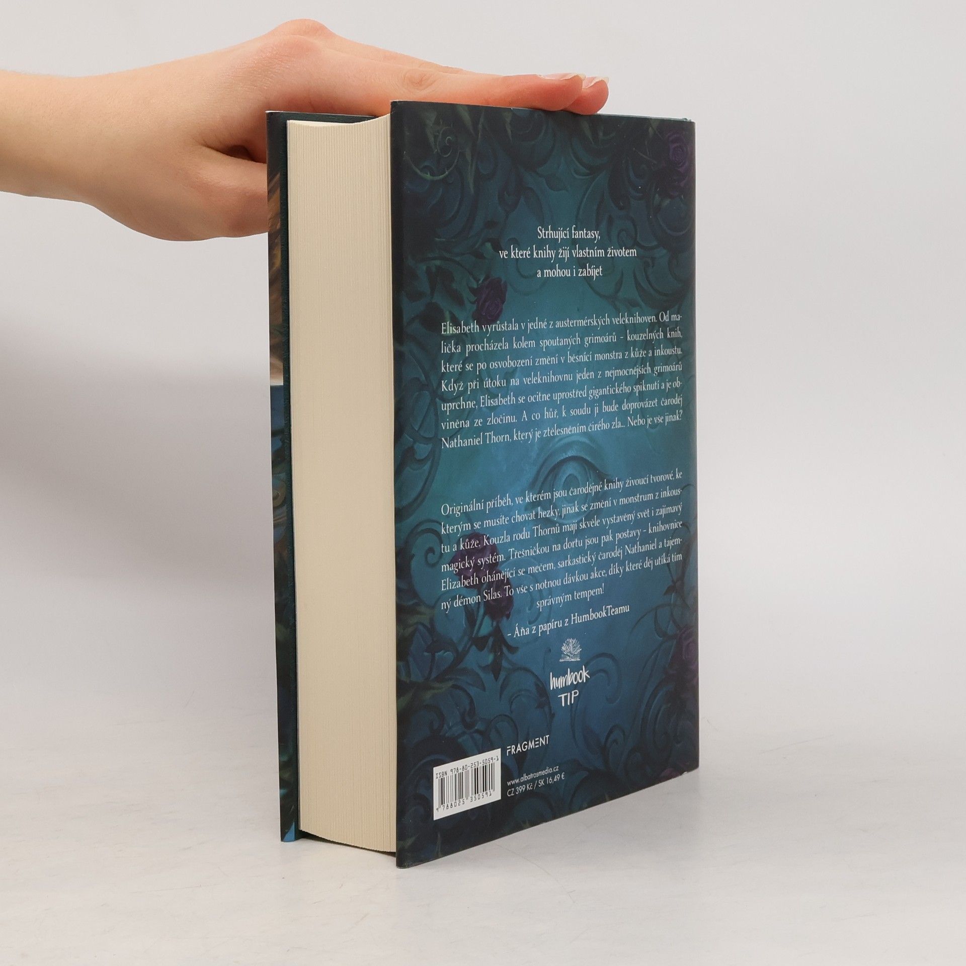 Strhující fantasy, ve které knihy žijí vlastním životem a mohou i zabíjet. Elisabeth vyrůstala v jedné z austermérských veleknihoven. Od malička procházela kolem spoutaných grimoárů – kouzelných knih, které se po osvobození změní v běsnící monstra z kůže a inkoustu. Když při útoku na veleknihovnu jeden z nejmocnějších grimoárů uprchne, Elisabeth se ocitne uprostřed gigantického spiknutí a je obviněna ze zločinu. A co hůř, k soudu ji bude doprovázet čaroděj Nathaniel Thorn, který je ztělesněním čirého zla… Nebo je vše jinak?