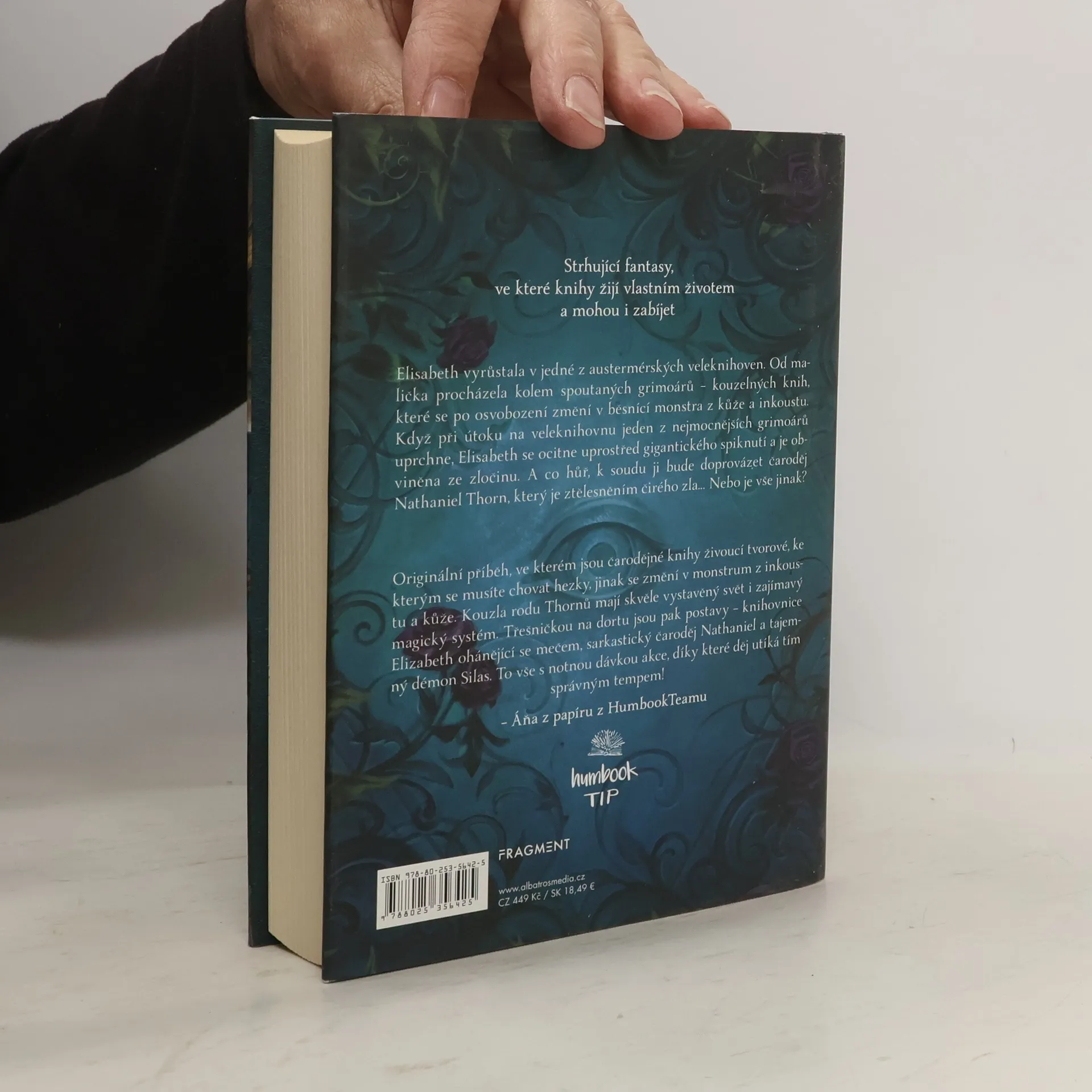 Strhující fantasy, ve které knihy žijí vlastním životem a mohou i zabíjet. Elisabeth vyrůstala v jedné z austermérských veleknihoven. Od malička procházela kolem spoutaných grimoárů – kouzelných knih, které se po osvobození změní v běsnící monstra z kůže a inkoustu. Když při útoku na veleknihovnu jeden z nejmocnějších grimoárů uprchne, Elisabeth se ocitne uprostřed gigantického spiknutí a je obviněna ze zločinu. A co hůř, k soudu ji bude doprovázet čaroděj Nathaniel Thorn, který je ztělesněním čirého zla… Nebo je vše jinak?