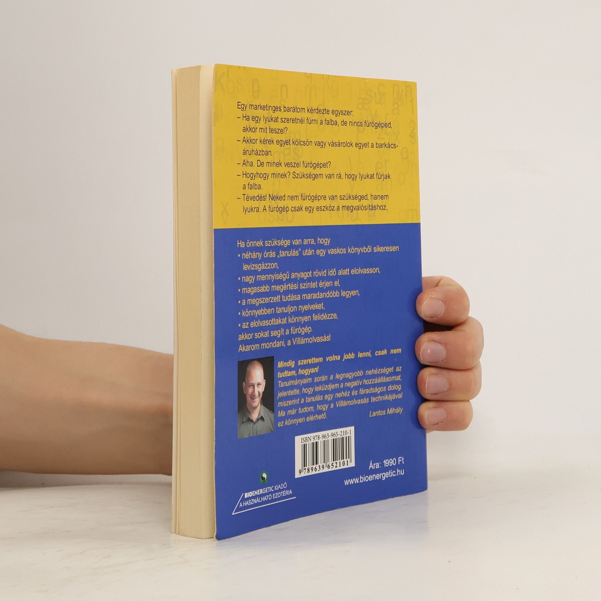 Egy marketinges barátom kérdezte egyszer:- Ha egy lyukat szeretnél fúrni a falba, de nincs fúrógéped, akkor mit teszel?- Akkor kérek egyet kölcsön vagy vásárolok egyet a barkácsáruházban.- Aha. De minek veszel fúrógépet?- Hogyhogy minek? Szükségem van rá, hogy lyukat fúrjak a falba.- Nagy tévedés! Neked nem fúrógépre van szükséged, hanem lyukra. A fúrógép csak egy eszköz ennek megvalósításához.Ha önnek szüksége van arra, hogy* néhány órás tanulás után egy vaskos könyvből sikeresen levizsgázzon...* nagy mennyiségű anyagot rövid idő alatt elolvasson...* magasabb megértési szintet érjen el...* megszerzett tudása maradandóbb legyen...* könnyebben tanuljon nyelveket...* az elolvasottakat könnyen felidézze...Akkor önnek a fúrógépre van szüksége!Akarom mondani... a Villámolvasásra!