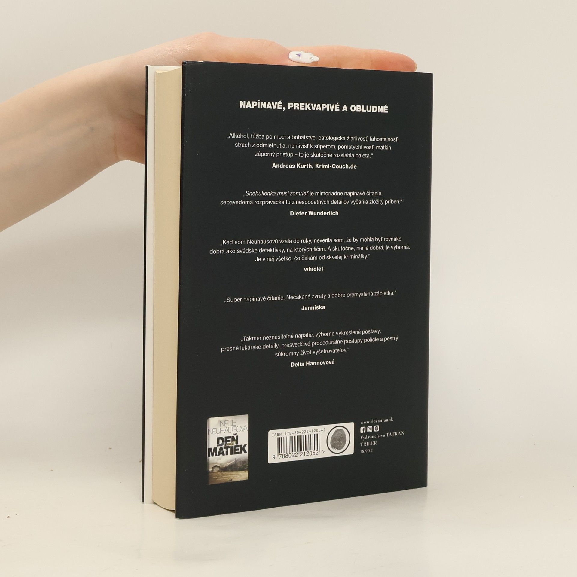 Pleť biela ako sneh, vlasy čierne ako eben a pery červené ako krv. Ak hádate, že to bude rozprávkový príbeh, čaká vás nemilé prekvapenie. Nele Neuhasová namiešala po úspešnom trileri Deň matiek ešte mrazivejší dúšok o skazenej ľudskej povahe. Snehulienka musí zomrieť má všetko, čo dobrá detektívka potrebuje: spád, napätie, majstrovskú zápletku... a k tomu dedinský klan posadnutý zvrátenou nenávisťou.