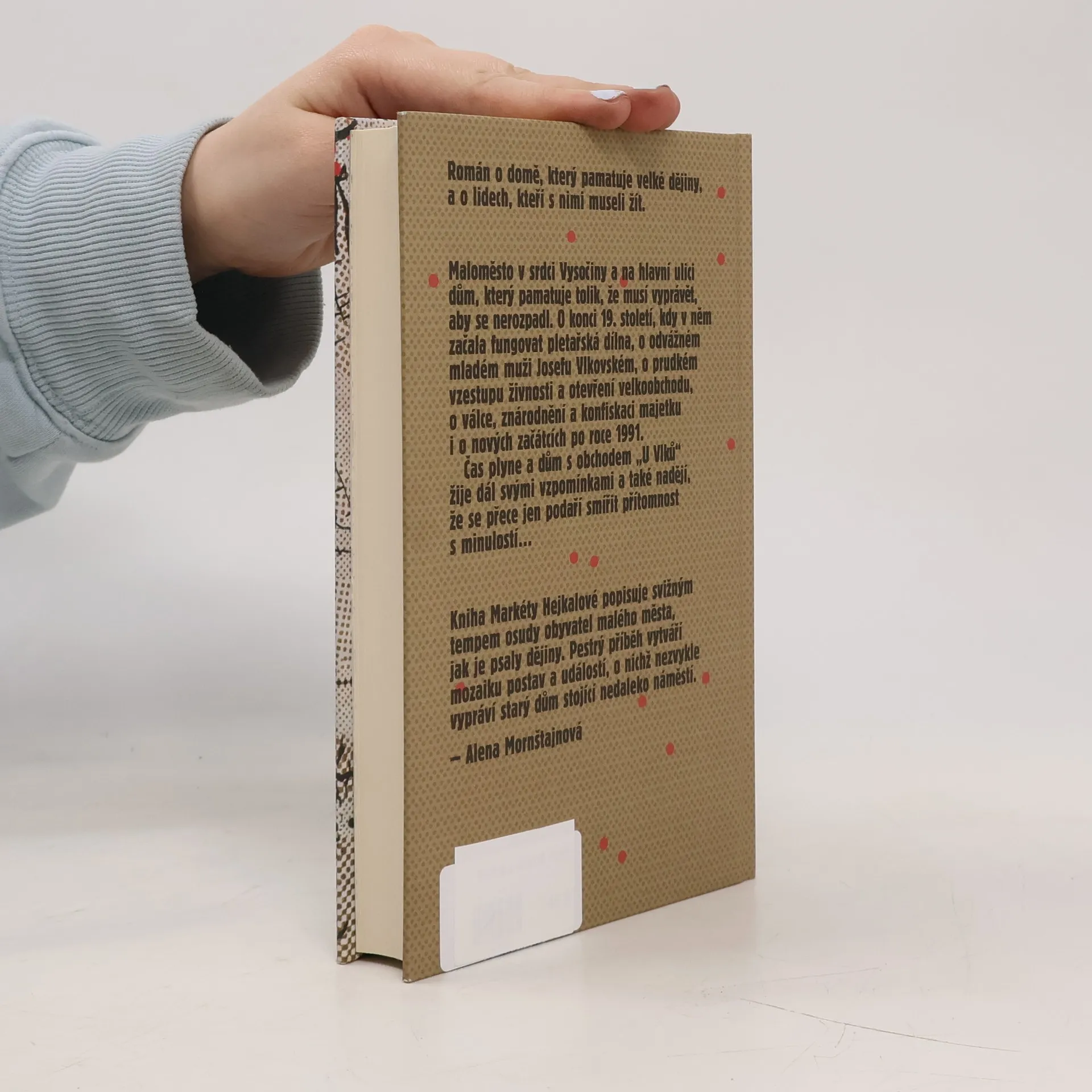 Román o pomíjivosti času a neměnnosti lidských životů.Starý dům na hlavní ulici kousek pod náměstím v malém městě na Vysočině jako by měl svou vlastní paměť. Osudy jeho obyvatel se do jeho stěn zapisovaly od roku 1695 a dům má co vyprávět. A tak vypráví. Především o konci devatenáctého století, kdy v něm začala fungovat pletařská dílna, z níž později vznikla velká a dodnes fungující továrna. O odvážném mladém muži Josefu Vlkovském, který si zde roku 1925 otevřel obchod s potravinami. O prudkém vzestupu živnosti, otevření velkoobchodu, ale i o válečných omezeních, rodinné tragédii, znárodnění a konfiskaci majetku. Dům vypráví svůj vlastní příběh, prolínající se s tragickým osudem ředitele textilní továrny Knopa, a pokračuje přes nové začátky a změny v devadesátých letech až do současnosti. Čas plyne, dům s obchodem „U Vlků“ zůstává. Skrze studentku Anežku si pak současnost podá na usmířenou ruku s minulostí. Markéta Hejkalová na pozadí vyprávění o historii jednoho domu postupně odkrývá silné osudy obyvatel kraje uprostřed naší země.