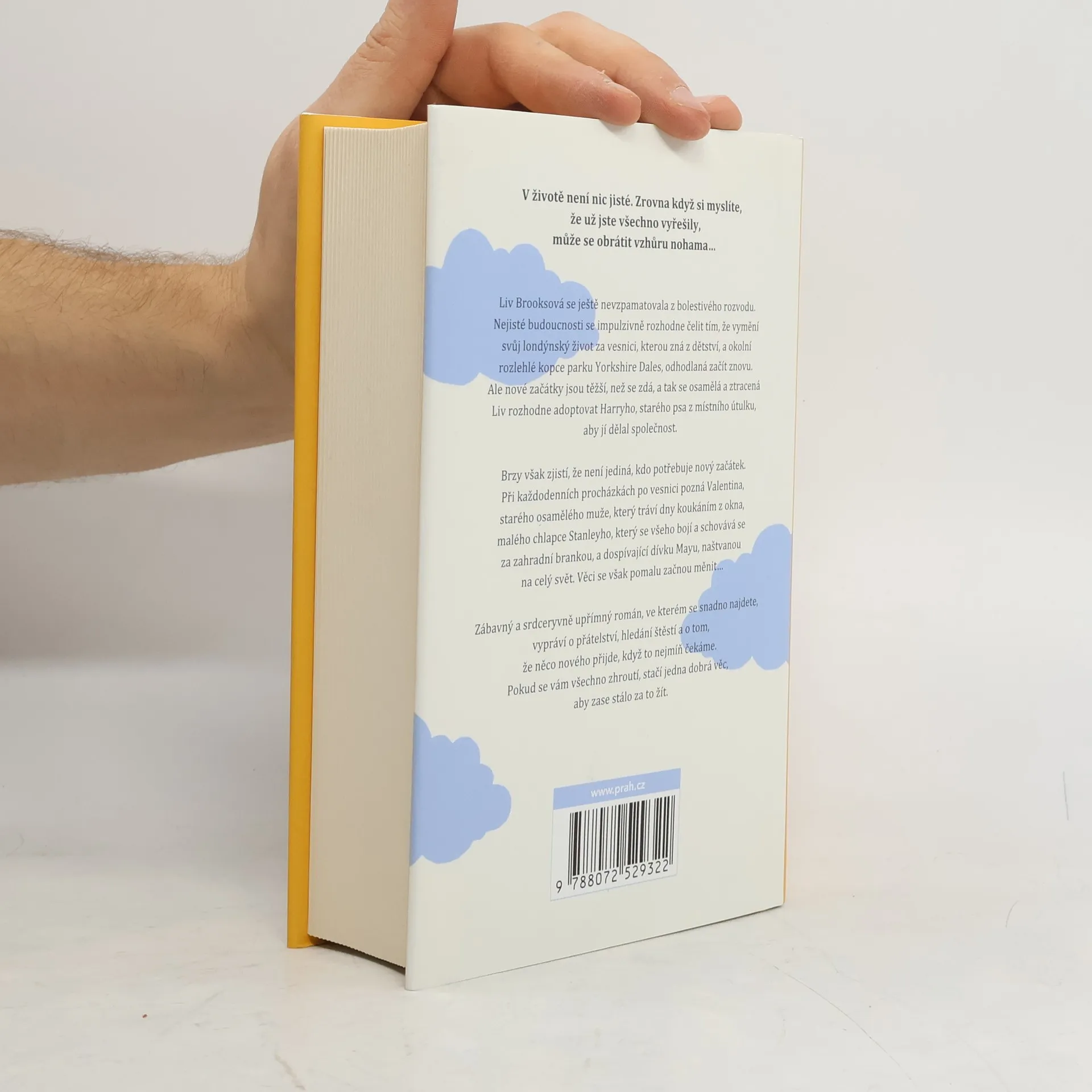 V životě není nic jisté. Zrovna když si myslíte, že už jste všechno vyřešily, může se obrátit vzhůru nohama… Liv Brooksová se ještě nevzpamatovala z bolestivého rozvodu. Nejisté budoucnosti se impulzivně rozhodne čelit tím, že vymění svůj londýnský život za vesnici, kterou zná z dětství, a okolní rozlehlé kopce parku Yorkshire Dales, odhodlaná začít znovu. Ale nové začátky jsou těžší, než se zdá, a tak se osamělá a ztracená Liv rozhodne adoptovat Harryho, starého psa z místního útulku, aby jí dělal společnost. Brzy však zjistí, že není jediná, kdo potřebuje novy´ začátek. Při každodenních procházkách po vesnici pozná Valentina, starého osamělého muže, který tráví dny koukáním z okna, malého chlapce Stanleyho, který se všeho bojí a schovává se za zahradní brankou, a dospívající dívku Mayu, naštvanou na cely´ svět. Věci se však pomalu začnou měnit… Zábavný a srdceryvně upřímný román, ve kterém se snadno najdete, vypráví o přátelství, hledání štěstí a o tom, že něco nového přijde, když to nejmíň čekáme. Pokud se vám všechno zhroutí, stačí jedna dobrá věc, aby zase stálo za to žít.