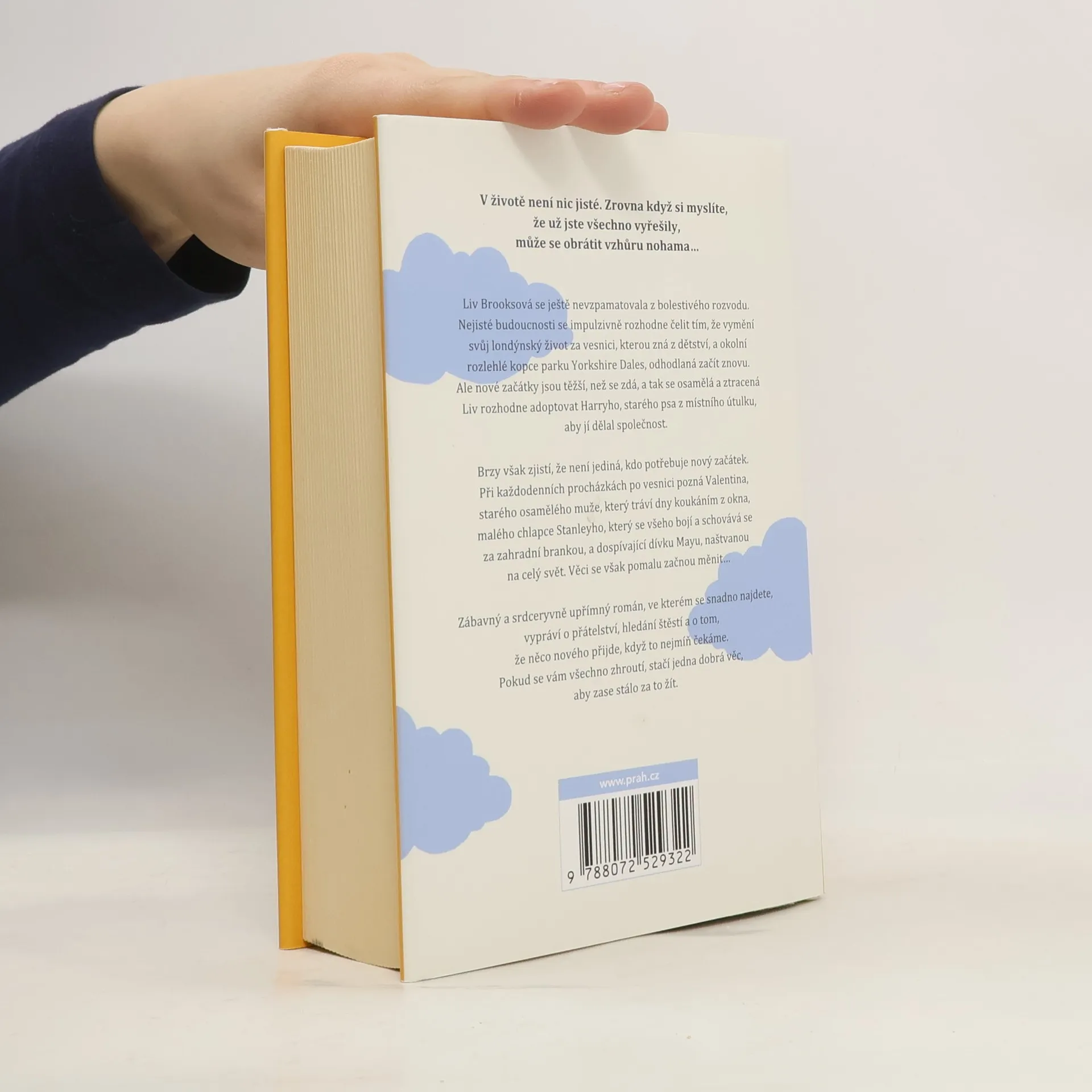 V životě není nic jisté. Zrovna když si myslíte, že už jste všechno vyřešily, může se obrátit vzhůru nohama… Liv Brooksová se ještě nevzpamatovala z bolestivého rozvodu. Nejisté budoucnosti se impulzivně rozhodne čelit tím, že vymění svůj londýnský život za vesnici, kterou zná z dětství, a okolní rozlehlé kopce parku Yorkshire Dales, odhodlaná začít znovu. Ale nové začátky jsou těžší, než se zdá, a tak se osamělá a ztracená Liv rozhodne adoptovat Harryho, starého psa z místního útulku, aby jí dělal společnost. Brzy však zjistí, že není jediná, kdo potřebuje novy´ začátek. Při každodenních procházkách po vesnici pozná Valentina, starého osamělého muže, který tráví dny koukáním z okna, malého chlapce Stanleyho, který se všeho bojí a schovává se za zahradní brankou, a dospívající dívku Mayu, naštvanou na cely´ svět. Věci se však pomalu začnou měnit… Zábavný a srdceryvně upřímný román, ve kterém se snadno najdete, vypráví o přátelství, hledání štěstí a o tom, že něco nového přijde, když to nejmíň čekáme. Pokud se vám všechno zhroutí, stačí jedna dobrá věc, aby zase stálo za to žít.