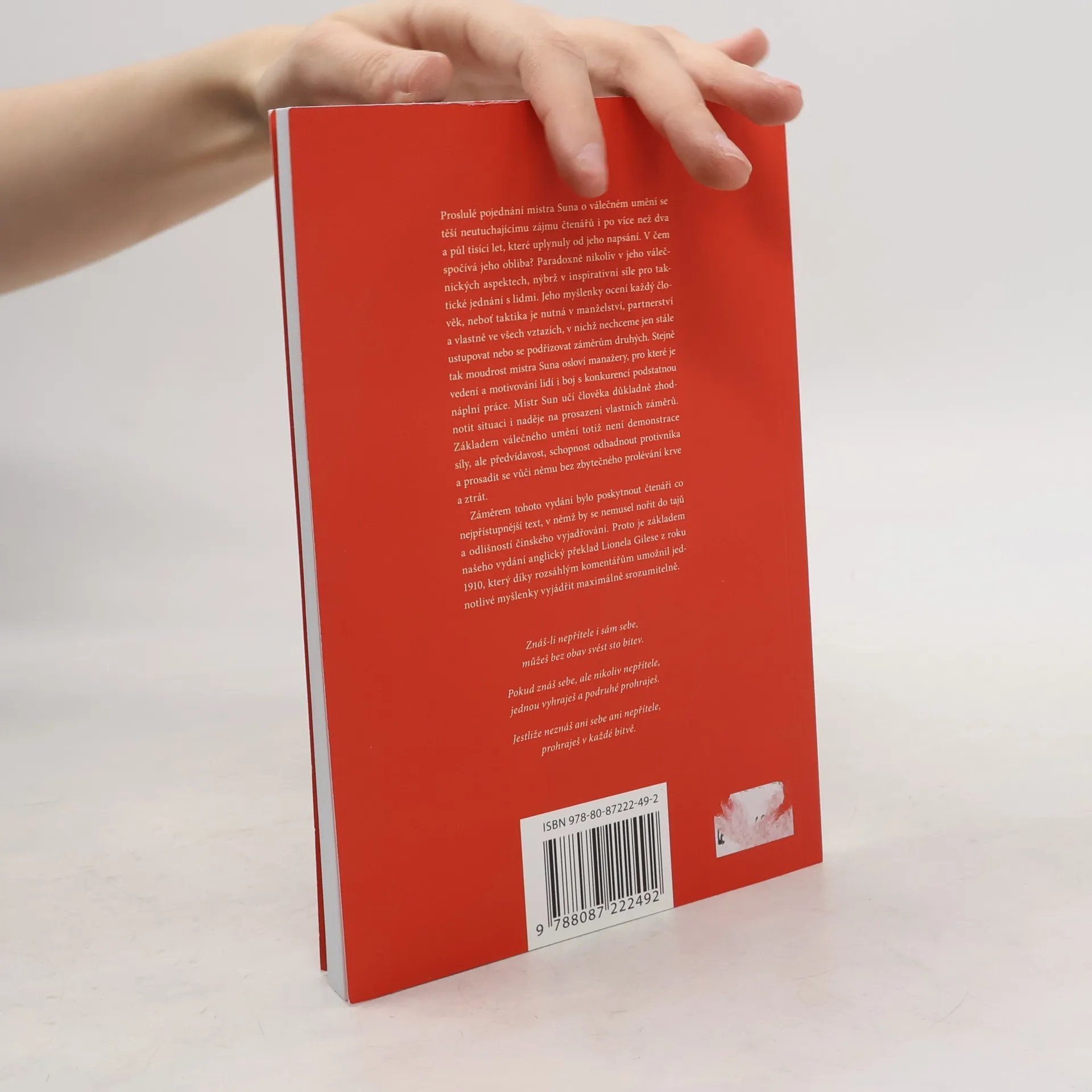 Proslulé pojednání mistra Suna o válečném umění se těší neutuchajícímu zájmu čtenářů i po více než dva a půl tisíci let, které uplynuly od jeho napsání. V čem spočívá jeho obliba? Paradoxně nikoliv v jeho válečnických aspektech, nýbrž v inspirativní síle pro taktické jednání s lidmi. Jeho myšlenky ocení každý člověk, neboť taktika je nutná v manželství, partnerství a vlastně ve všech vztazích, v nichž nechceme jen stále ustupovat nebo se podřizovat záměrům druhých. Stejně tak moudrost mistra Suna osloví manažery, pro které je vedení a motivování lidí i boj s konkurencí podstatnou náplní práce. Mistr Sun učí člověka důkladně zhodnotit situaci i naděje na prosazení vlastních záměrů. Základem válečného umění totiž není demonstrace síly, ale předvídavost, schopnost odhadnout protivníka a prosadit se vůči němu bez zbytečného prolévání krve a ztrát. Záměrem tohoto vydání bylo poskytnout čtenáři co nejpřístupnější text, v němž by se nemusel nořit do tajů a odlišností čínského vyjadřování. Proto je základem našeho vydání anglický překlad Lionela Gilese z roku 1910, který díky rozsáhlým komentářům umožnil jednotlivé myšlenky vyjádřit maximálně srozumitelně.