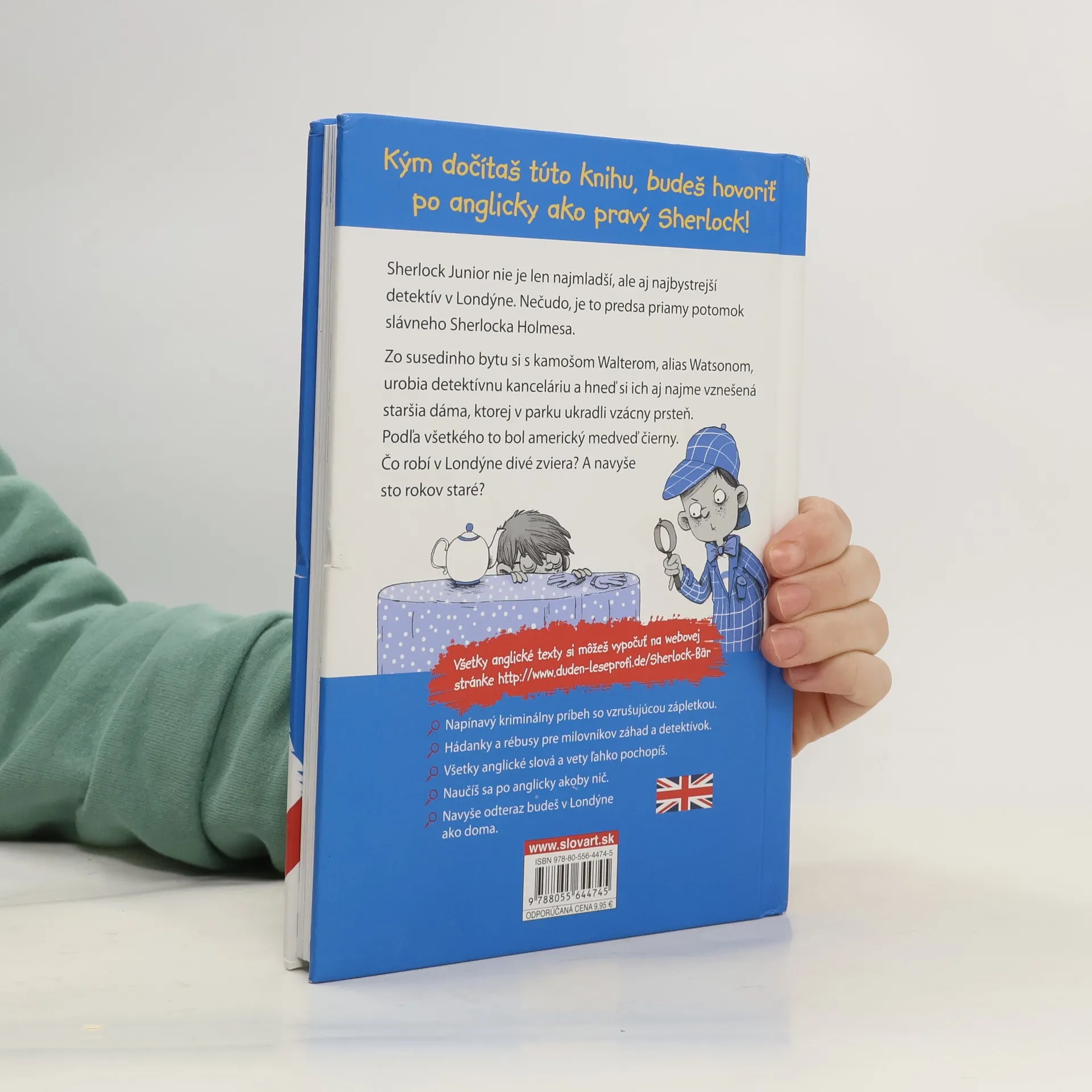 V prvej časti novej kriminálnej série pre deti môžete záhadné detektívne prípady riešiť spolu s hlavnými hrdinami, a zároveň sa len tak mimochodom naučiť anglické slová a frázy, ktoré sa dajú ľahko pochopiť zo slovenského textu. Sherlock Junior nie je len najmladší, ale aj najbystrejší detektív v Londýne. Nie div, je predsa priamym potomkom slávneho detektíva. Aspoň to tvrdí... Byt odcestovanej susedky prerobia spolu s Waltrom, alias Watsonom, na detektívnu kanceláriu a na prvý prípad nemusia dlho čakať. Najme si ich jedna staršia dáma, ktorej niekto v parku ukradol prsteň. Podľa všetkého to bol čierny medveď. Kradnú však medvede prstene? Sherlock a Watson sa pustia do pátrania po záhadnom zvierati.