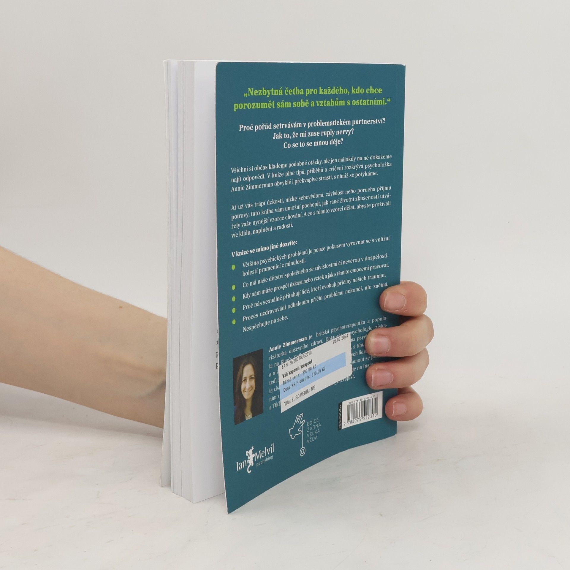 Nezbytná četba pro každého, kdo chce porozumět sám sobě a vztahům s ostatními. Proč setrvávám v problematickém partnerství? Jak to, že mi zase ruply nervy? Co se to se mnou děje? Všichni si občas klademe podobné otázky, ale jen málokdy na ně dokážeme najít odpovědi. V knize plnétipů, příběhů a cvičení rozkrývá psycholožka Annie Zimmerman obvyklé i překvapivé strasti, s nimiž se potýkáme. Ať už vás trápí úzkosti, nízké sebevědomí, závislost a nebo porucha příjmu potravy, tato kniha vám umožní pochopit, jak rané životní zkušenosti utvářely vaše nynější vzorce chování. A co s těmito vzorci dělat, abyste prožívali víc klidu, naplnění a radosti. V knize se mimo jiné dozvíte - Většina psychických problémů je pouze pokusem vyrovnat se s vnitřní bolestí pramenící z minulosti. - Co má naše dětství společného se závislostmi či nevěrou v dospělosti. - Kdy nám může prospět úzkost nebo vztek a jak s těmito emocemi pracovat. - Proč nás sexuálně přitahují lidé, kteří evokují příčiny našich traumat. - Proces uzdravování odhalením příčin problému nekončí, ale začíná. Nespěchejte na sebe.