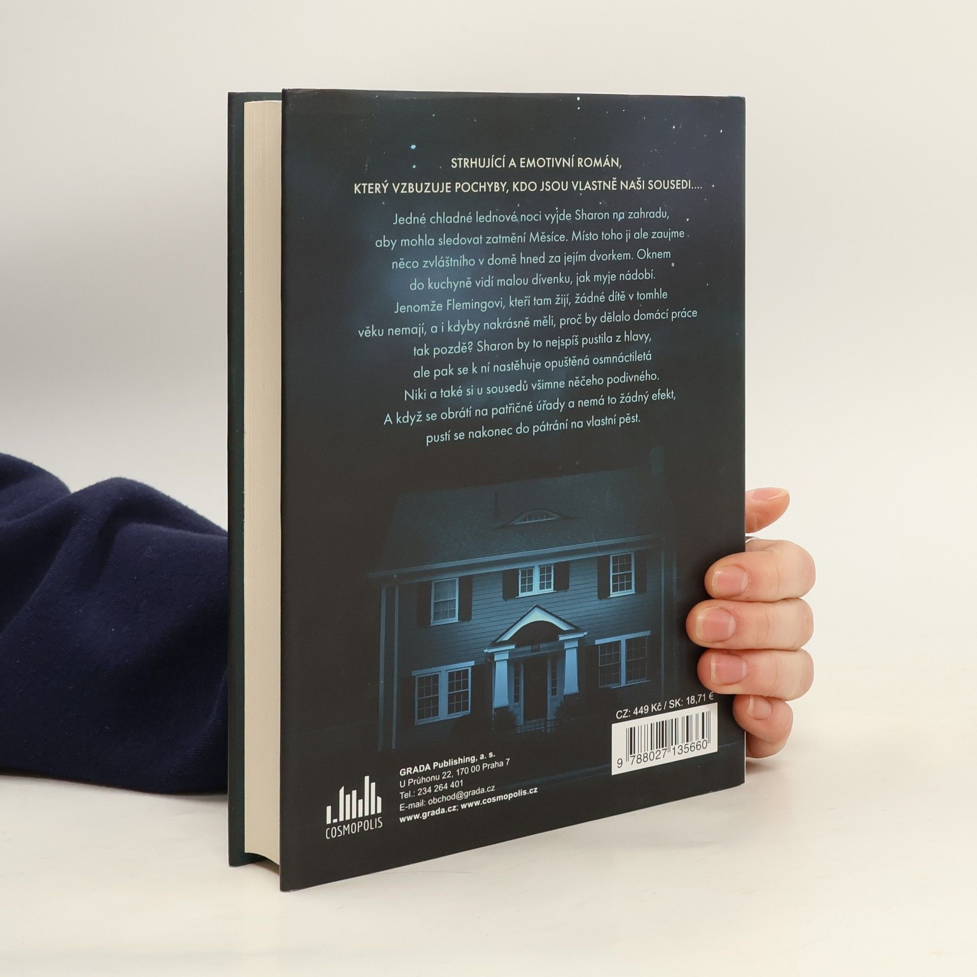 Napínavý román o tom, že nikdy nevíme, kdo jsou vlastně naši sousedé Jedné chladné lednové noci vyjde Sharon na zahradu, aby mohla sledovat zatmění Měsíce. Místo toho ji ale zaujme něco zvláštního v domě hned za jejím dvorkem. Oknem do kuchyně vidí malou dívenku, jak myje nádobí. Jenomže Flemingovi, kteří tam žijí, žádné dítě v tomhle věku nemají, a i kdyby nakrásně měli, proč by dělalo domácí práce tak pozdě? Sharon by to nejspíš pustila z hlavy, ale pak se k ní nastěhuje opuštěná osmnáctiletá Niki a také si u sousedů všimne něčeho podivného. A když se obrátí na patřičné úřady a nemá to žádný efekt, pustí se nakonec do pátrání na vlastní pěst.