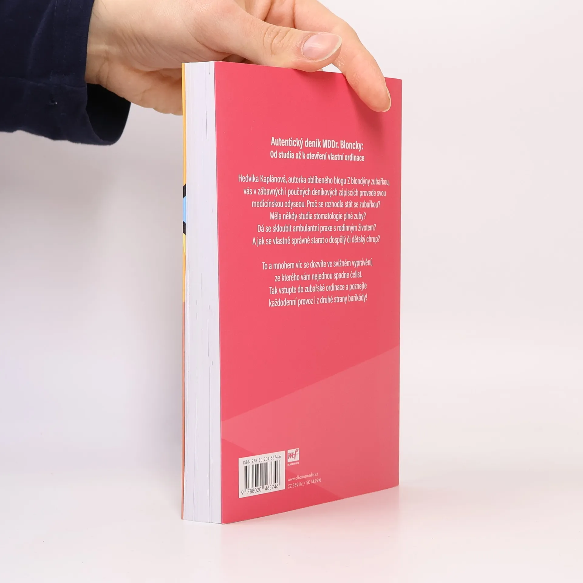 Autentický deník MDDr. Bloncky: od studia až k otevření vlastní ordinace. Hedvika Kaplánová, autorka oblíbeného blogu Z blondýny zubařkou, vás v zábavných i poučných deníkových zápiscích provede svou medicínskou odyseou. Proč se rozhodla stát zubařkou? Měla někdy studia stomatologie plné zuby? Dá se skloubit ambulantní praxe s rodinným životem? A jak se vlastně správně starat o dospělý či dětský chrup? To a mnohem víc se dozvíte ve svižném vyprávění, ze kterého vám nejednou spadne čelist. Tak vstupte do zubařské ordinace a poznejte každodenní provoz i z druhé strany barikády! Nakladatelská anotace.