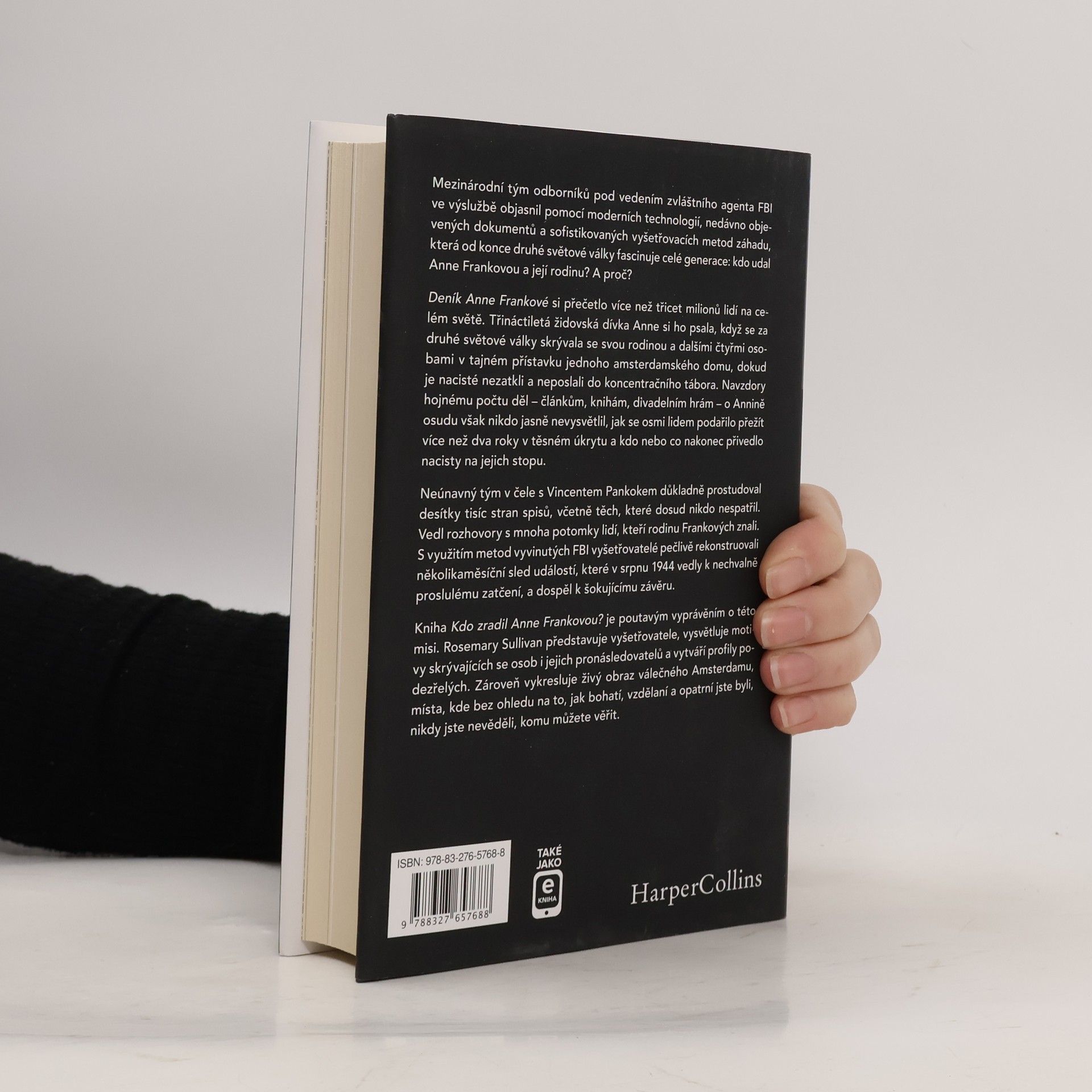 Deník Anne Frankové, který si přečetlo více než třicet milionů lidí, je svědectvím o životě třináctileté židovské dívky, která se během druhé světové války skrývala se svou rodinou v tajném Přístavku v Amsterdamu. Po jejich zatčení nacisty zůstává záhadou, kdo je zradil a proč. I přes množství článků, knih a divadelních her o Annině osudu nikdo jasně nevysvětlil, jak se osmi lidem podařilo přežít v úkrytu a co je nakonec prozradilo. Tuto záhadu objasnil mezinárodní tým odborníků pod vedením bývalého agenta FBI Vincenta Pankokeho. S využitím moderních technologií a nedávno objevených dokumentů tým důkladně prostudoval desítky tisíc stran spisů a vedl rozhovory s potomky lidí, kteří rodinu Frankových znali. Pomocí metod vyvinutých FBI pečlivě rekonstruovali události vedoucí k zatčení v srpnu 1944 a dospěli k šokujícímu závěru. Autorka, novinářka a historička Rosemary Sullivan, v knize poutavě vypráví o této misi, představuje vyšetřovatele, motivy skrývajících se osob a jejich pronásledovatelů, a vytváří profily podezřelých, zatímco barvitě vykresluje válečné Amsterdam, kde nikdo nemohl vědět, komu může věřit.