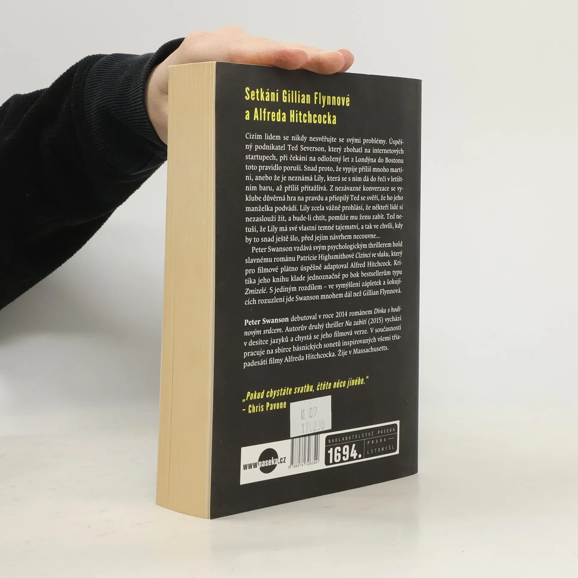 Cizím lidem se nikdy nesvěřujte se svými problémy. Úspěšný mladý muž Ted Severson, který zbohatl na internetových start-upech, při nočním letu z Londýna do Bostonu toto pravidlo poruší. Omluvou mu může být, že vypil příliš mnoho martini, a pak také to, že neznámá Lily, s níž se dá do řeči, se mu zdá až příliš přitažlivá. Z nezávazné konverzace se vyklube důvěrná hra na pravdu - a opilý Ted se v letadle svěří, že ho jeho manželka podvádí. Lily mu na oplátku navrhne, že jeho nevěrnou ženu zabije. Ted netuší, že Lily má své vlastní vražedné tajemství, a tak ve chvíli, kdy by to snad ještě šlo, před jejím návrhem necouvne… Peter Swanson vzdává svým psychologickým thrillerem hold slavnému románu Patricie Highsmithové Cizinci ve vlaku a americká kritika jeho knihu klade jednoznačně po bok bestsellerům typu Zmizelé. S jediným rozdílem - Peter Swanson jde mnohem dál.