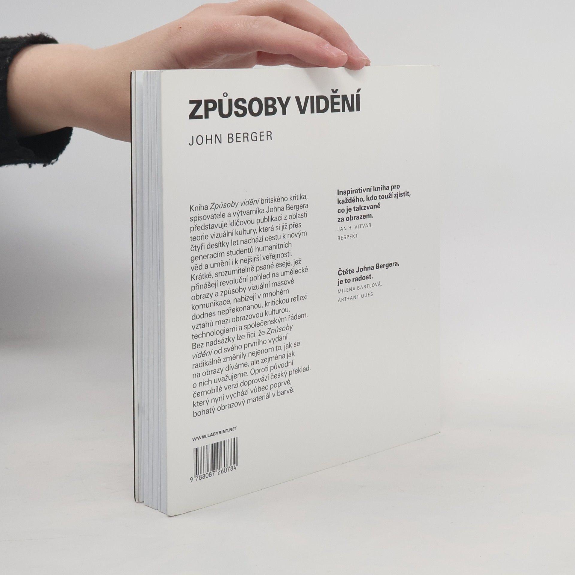 Jedna z nejinspirativnějších a nejvlivnějších knih o umění a vizualitě, která je právem považována za zakladatelskou klasiku oboru vizuálních studií. Poprvé vyšla v roce 1972, ale dodnes neztratila nic ze své břitké pronikavosti, s níž bezprostředně a srozumitelně zpřístupňuje základní vědění o obrazech a dívání, do té doby zastřené sofistikovanými mystifikacemi profesionálních teoretiků a kritiků. Sedm esejů (z nichž tři jsou čistě obrazové) se zabývá takovými tématy, jako jsou moderní reprodukce starých mistrů, zobrazováním ženské nahoty, vztahu vidění a moci anebo reklamou. Kniha Způsoby vidění (Ways of Seeing) britského kritika, spisovatele a výtvarníka Johna Bergera (nar. 1926) představuje klíčovou publikaci z oblasti teorie vizuální kultury. Oproti původní černobílé verzi český překlad, který nyní vychází vůbec poprvé, doprovází bohatý obrazový materiál v barvě.