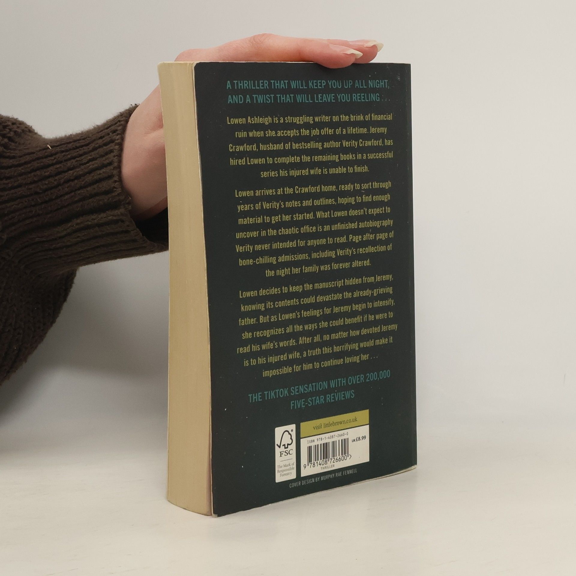 A thriller that will keep you up all night, and a twist that will leave you reeling... Lowen Ashleigh is a struggling writer on the brink of financial ruin when she accepts the job offer of a lifetime. Jeremy Crawford, husband of bestselling author Verity Crawford, has hired Lowen to complete the remaining books in a successful series his injured wife is unable to finish. Lowen arrives at the Crawford home, ready to sort through years of Verity's notes and outlines, hoping to find enough material to get her started. What Lowen doesn't expect to uncover in the chaotic office is an unfinished autobiography Verity never intended for anyone to read. Page after page of bone-chilling admissions, including Verity's recollection of the night their family was forever altered. Lowen decides to keep the manuscript hidden from Jeremy, knowing its contents would devastate the already-grieving father. But as Lowen's feelings for Jeremy begin to intensify, she recognizes all the ways she could benefit if he were to read his wife's words. After all, no matter how devoted Jeremy is to his injured wife, a truth this horrifying would make it impossible for him to continue loving her . . .