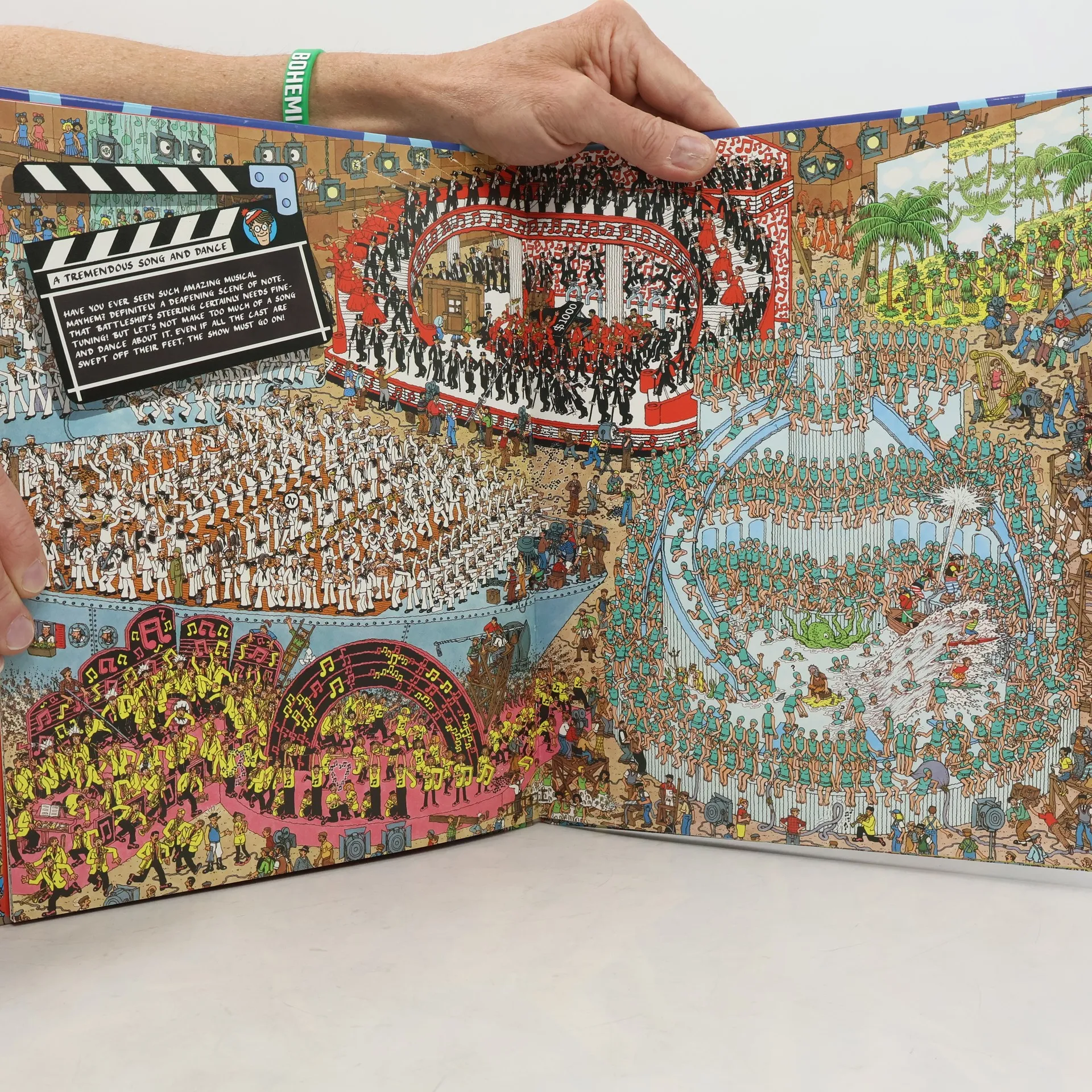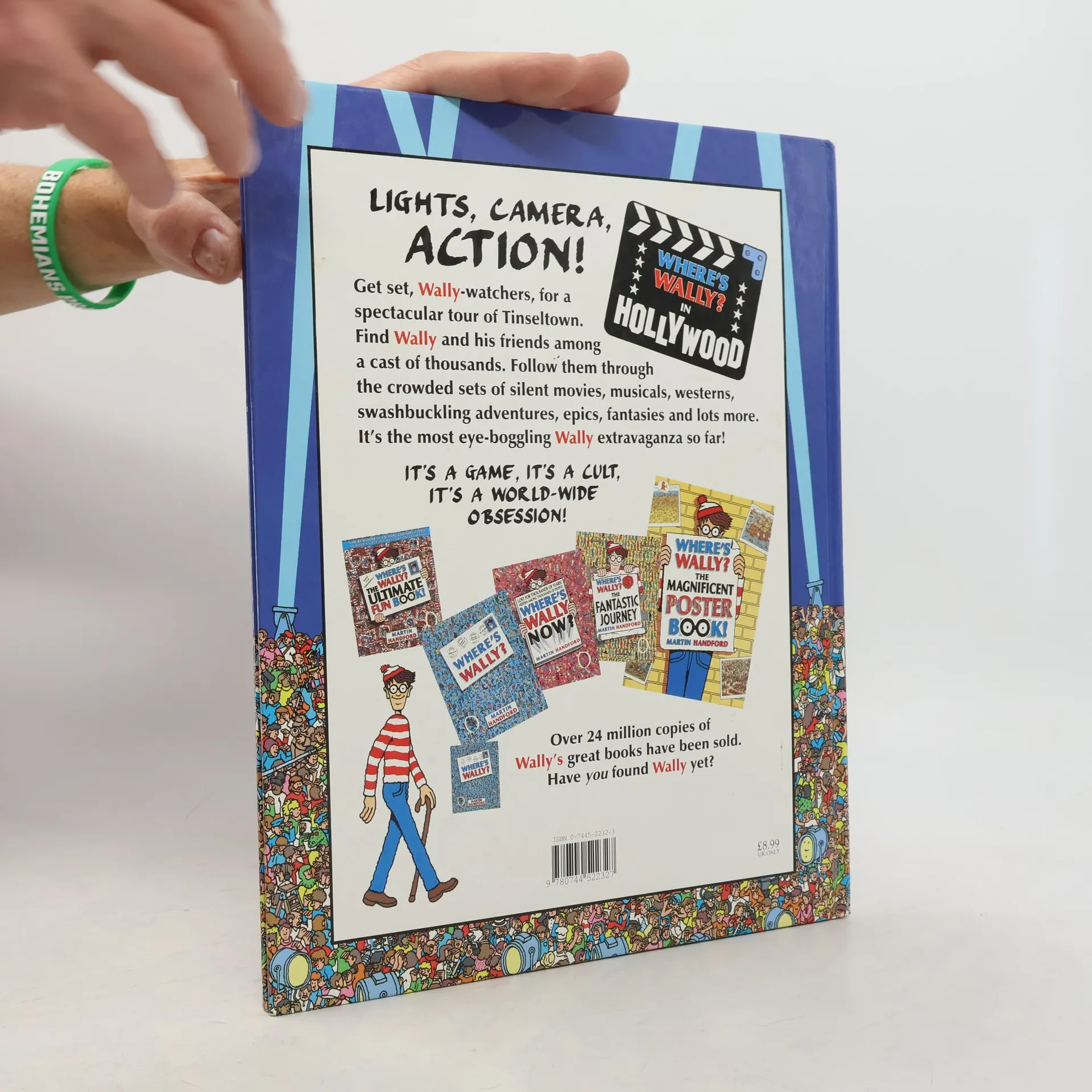 Hey, Waldo fans! Sharpen your eyes and your wits, because Waldo is taking you on a whole new star-studded adventure. That's right, you're going to Hollywood! Follow Waldo—if you can find him—through a cast of thousands on the bustling streets of the great movie classics. Is he there in the chorus line of that musical in production, or up on the ramparts of that epic war film? Or is our elusive, bespectacled hero right in the middle of the swashbuckling escapades of the Three Musketeers? Waldo and all his lost objects are harder to find than ever in this hilarious new challenge for eager Waldo-hunters everywhere!